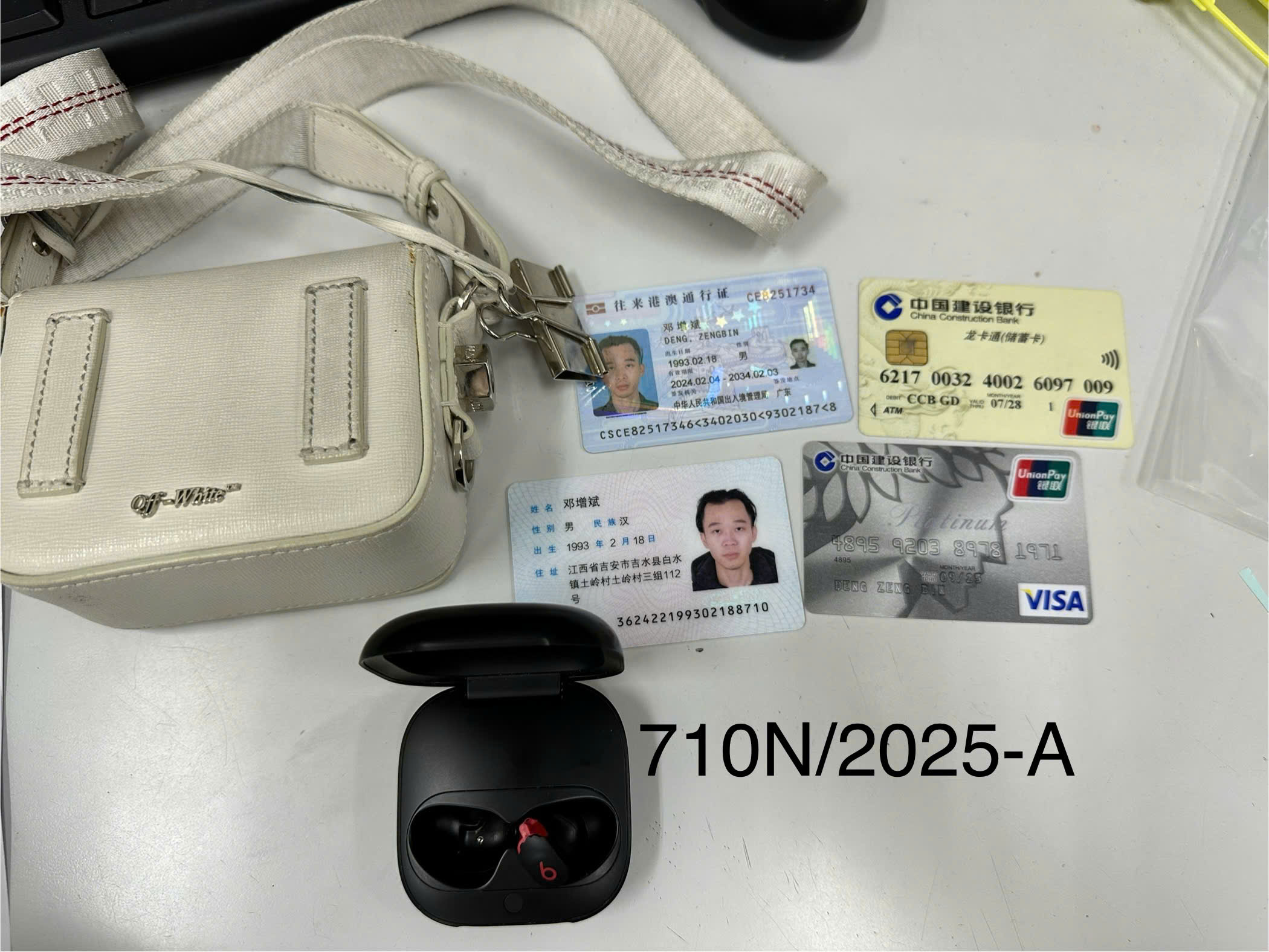Ngày tiếp nhận: 19/4/2025 Mã hồ sơ: 710N2025A Mô tả: 01 túi nhỏ trắng chữ “Off-white” có tai nghe không dây đen chữ “b” (chỉ có tai nghe phải) và 04 thẻ nhựa mang tên DENG ZENG BIN. |