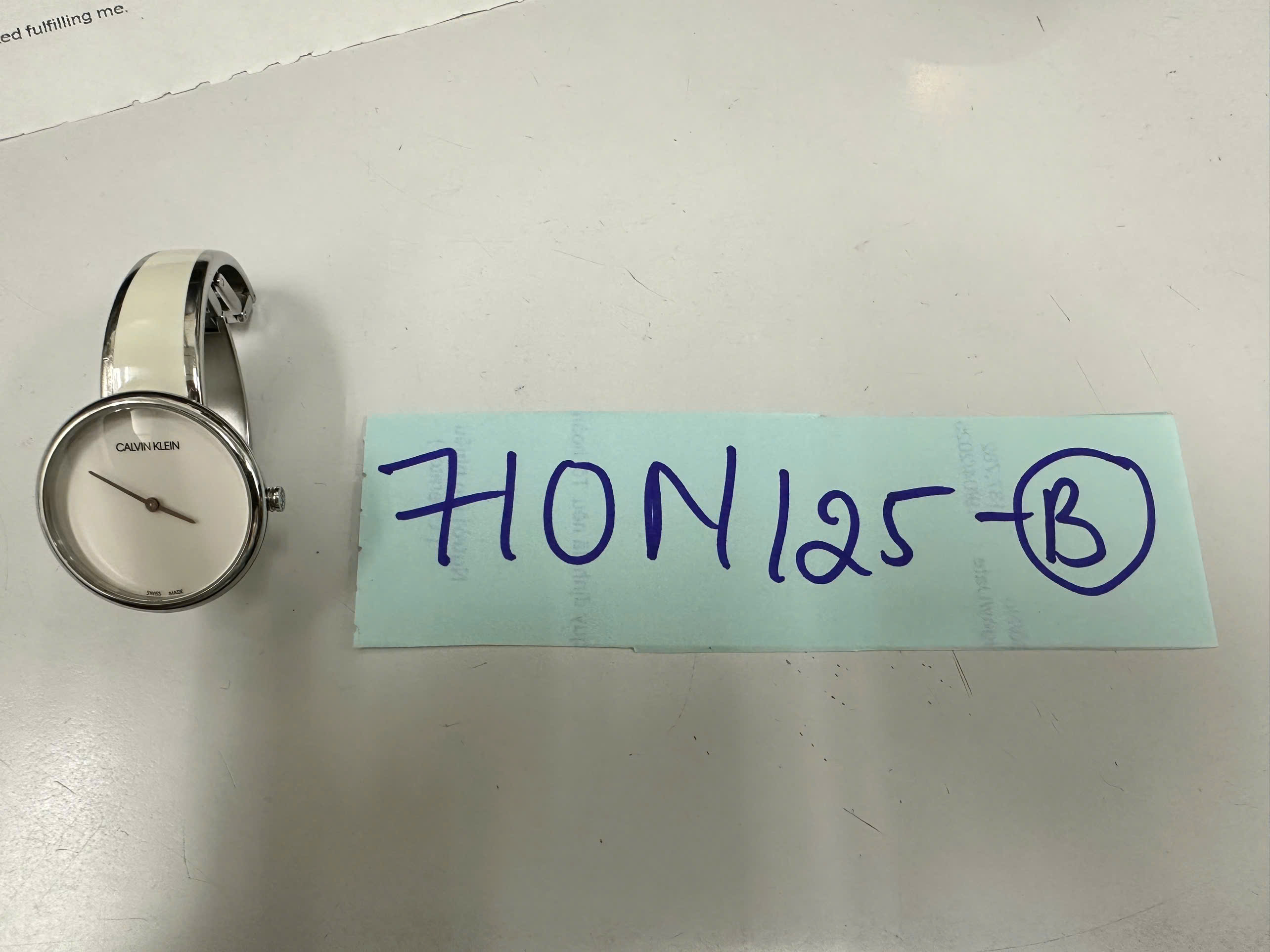 Ngày tiếp nhận: 19/4/2025 Mã hồ sơ: 710N2025B Mô tả: 01 đồng hồ kim loại màu trắng, mặt đồng hồ hình tròn có logo chữ “CALVIN KLEIN". |
