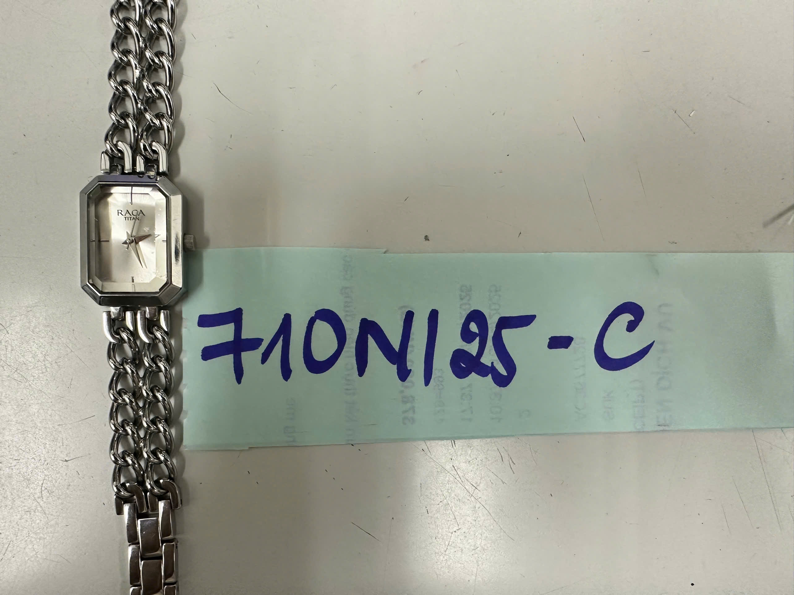Ngày tiếp nhận: 19/4/2025 Mã hồ sơ: 710N2025C Mô tả: 01 đồng hồ kim loại màu trắng, mặt đồng hồ hình chữ nhật có logo chữ “RAGA". |
