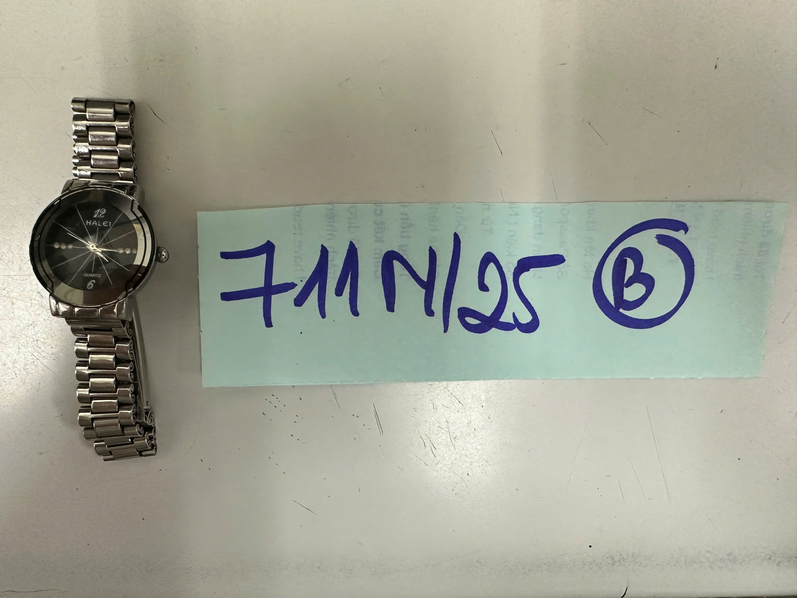 Ngày tiếp nhận: 19/4/2025 Mã hồ sơ: 711N2025B Mô tả: 01 Đồng hồ HALEI mặt tròn dây kim loại màu đen. |