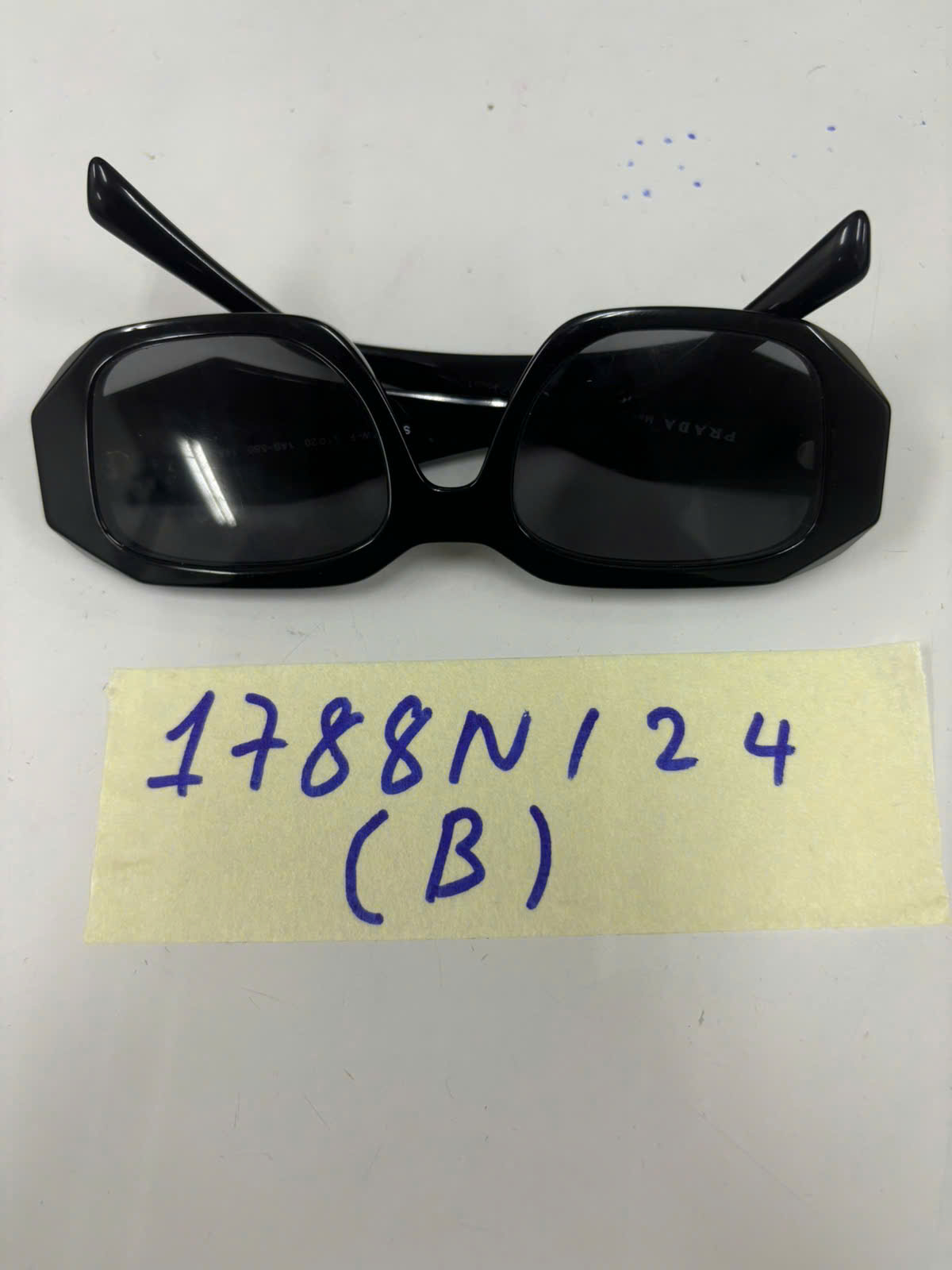 Ngày tiếp nhận: 20/10/2024 Mã hồ sơ: 1788N2024B Mô tả: 01 mắt kính gọng nhựa, tròng kính màu đen có chữ PRADA. |