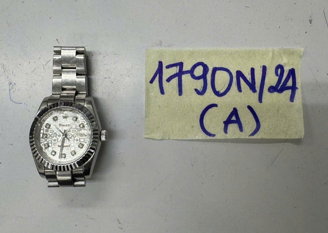 Ngày tiếp nhận: 21/10/2024 Mã hồ sơ: 1790N2024A Mô tả: 01 Đồng hồ có in logo chữ ROLEX dây kim loại màu bạc. |
