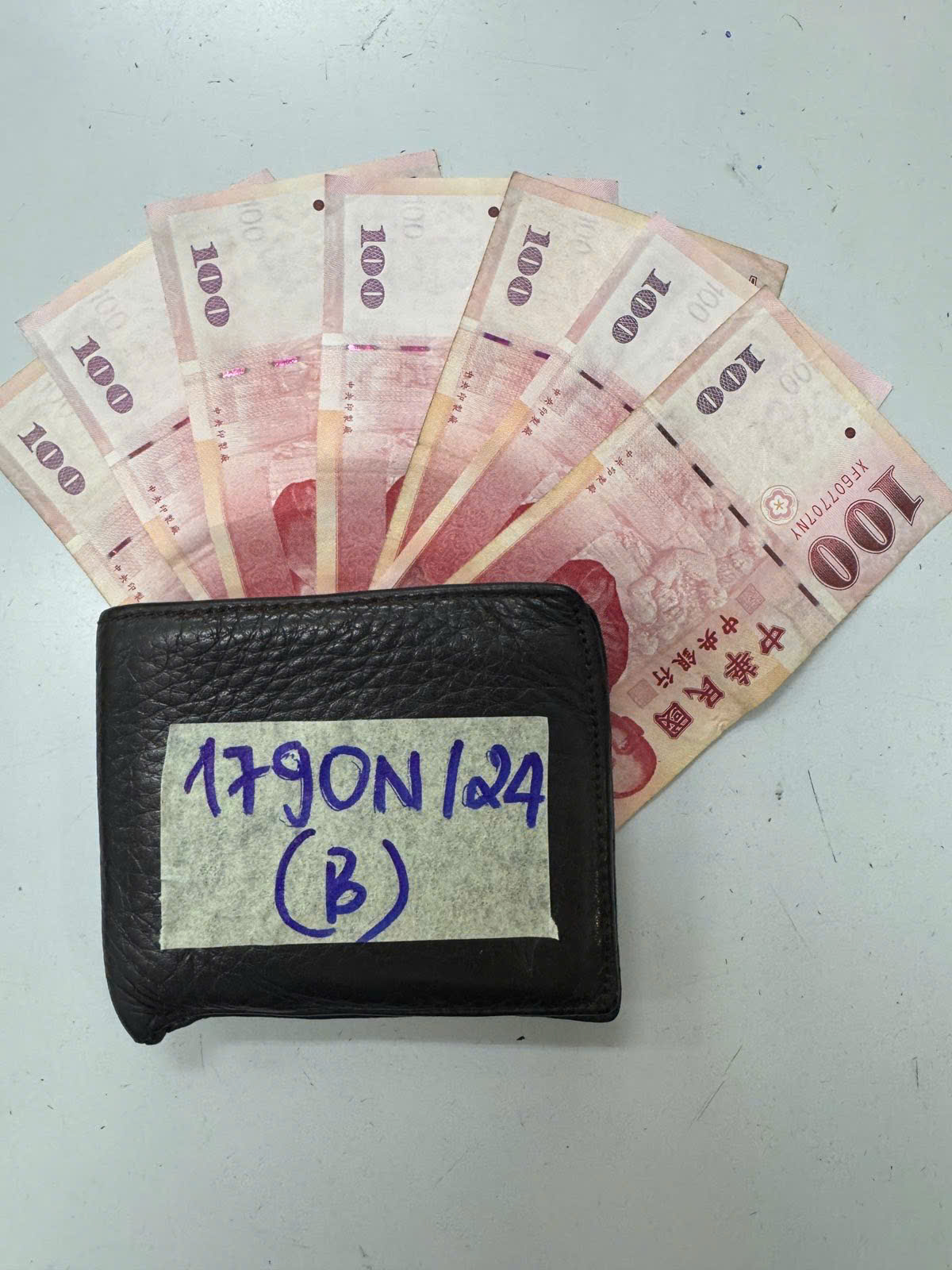 Ngày tiếp nhận: 21/10/2024 Mã hồ sơ: 1790N2024B Mô tả: 01 Bóp da màu nâu bên trong có: 07 (bảy) tờ 100 (một trăm) đài tệ, 01 (một) tờ giấy tùy thân có mã số: M100893284. |