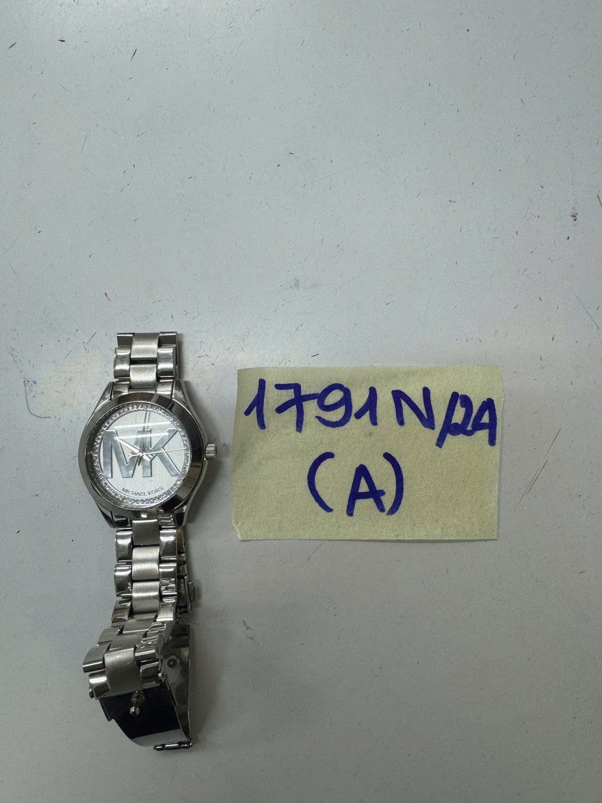 Ngày tiếp nhận: 21/10/2024 Mã hồ sơ: 1791N2024A Mô tả: 01 Đồng hồ mặt tròn bằng kim loại có in logo chữ "MK MICHAEL KORS", dây kim loại màu bạc, mặt sau có dãy số 111503. |