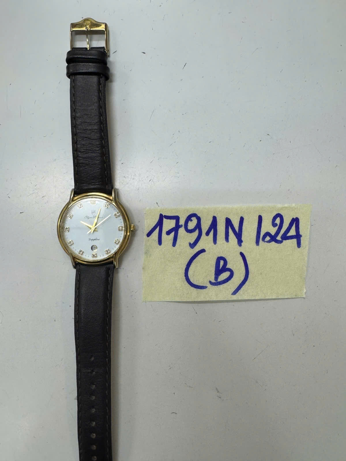 Ngày tiếp nhận: 21/10/2024 Mã hồ sơ: 1791N2024B Mô tả: 01 Đồng hồ mặt tròn bằng kim loại màu vàng, mặt đồng hồ có chữ OLYM PIANUS, mặt sau có dãy số 151-2M-616. |