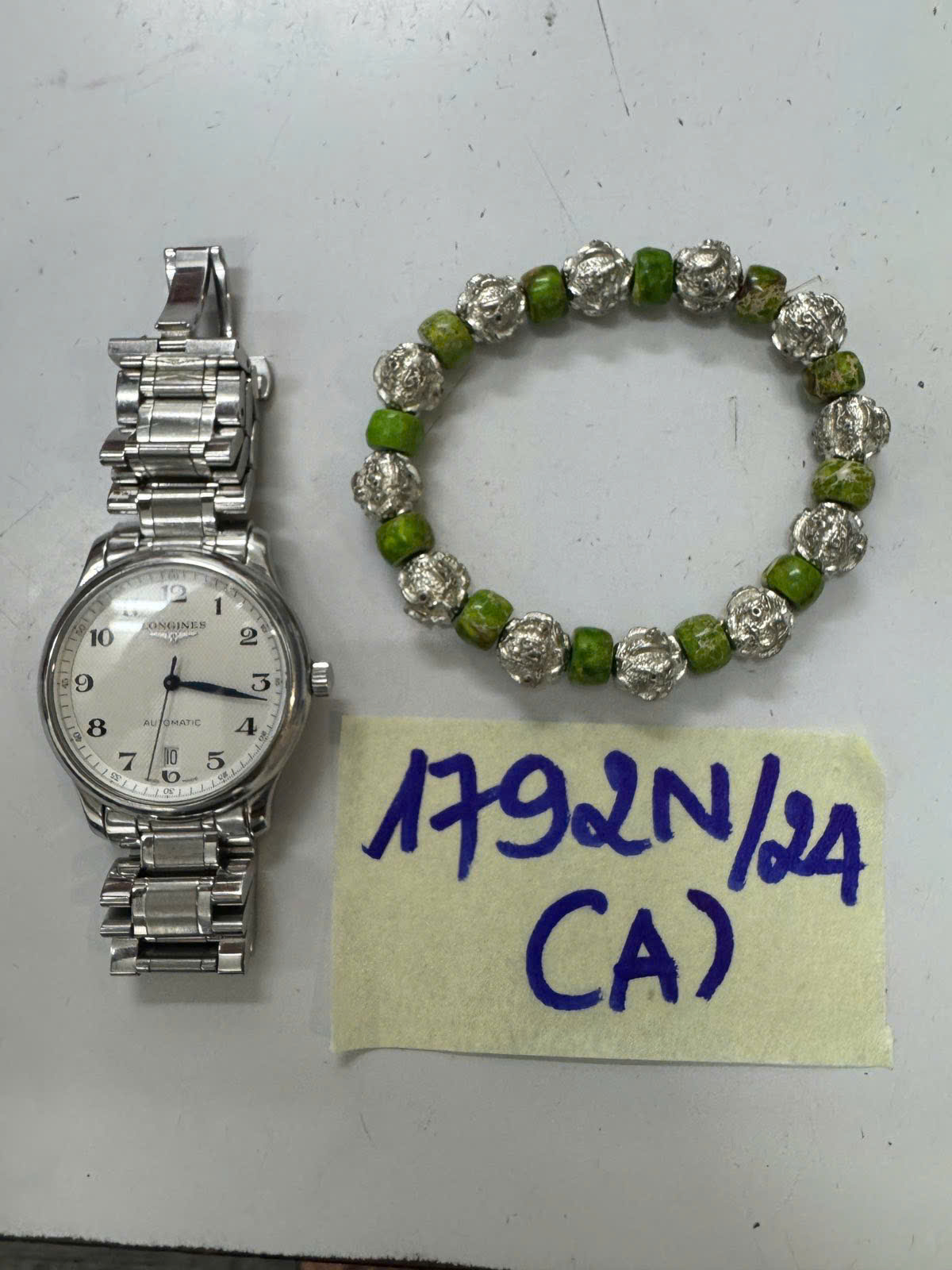 Ngày tiếp nhận: 21/10/2024 Mã hồ sơ: 1792N2024A Mô tả: 01 Đồng hồ màu bạc mặt hình tròn, dây đeo kim loại màu bạc, trên đồng hồ có chữ LONGINES; 01 (một) vòng đeo tay trên phòng có các hạt màu bạc và xanh lá. |