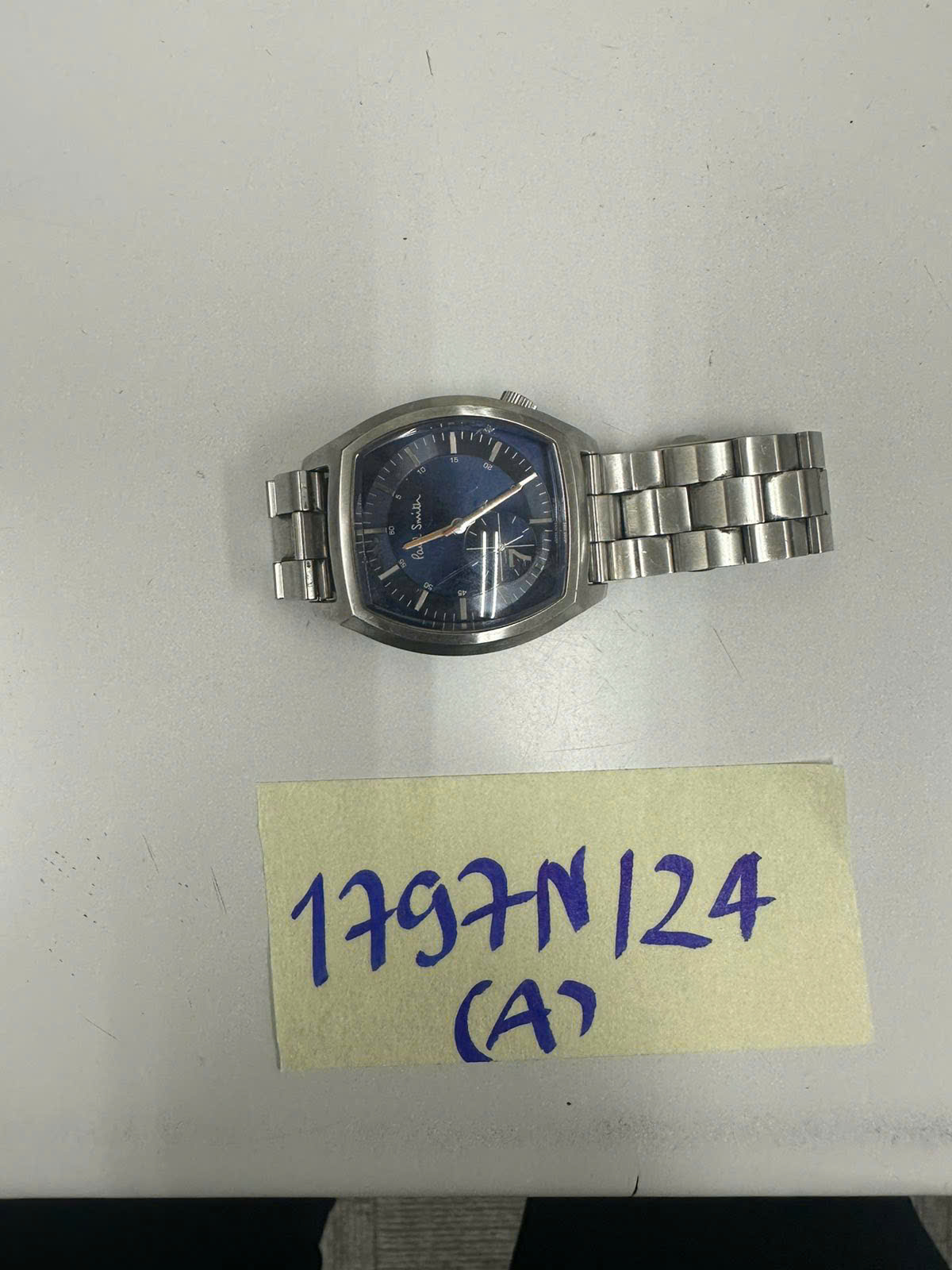 Ngày tiếp nhận: 21/10/2024 Mã hồ sơ: 1797N2024A Mô tả: 01 đồng hồ kim loại màu trắng mặt vuông màu xanh có chữ PANL SMITH. |