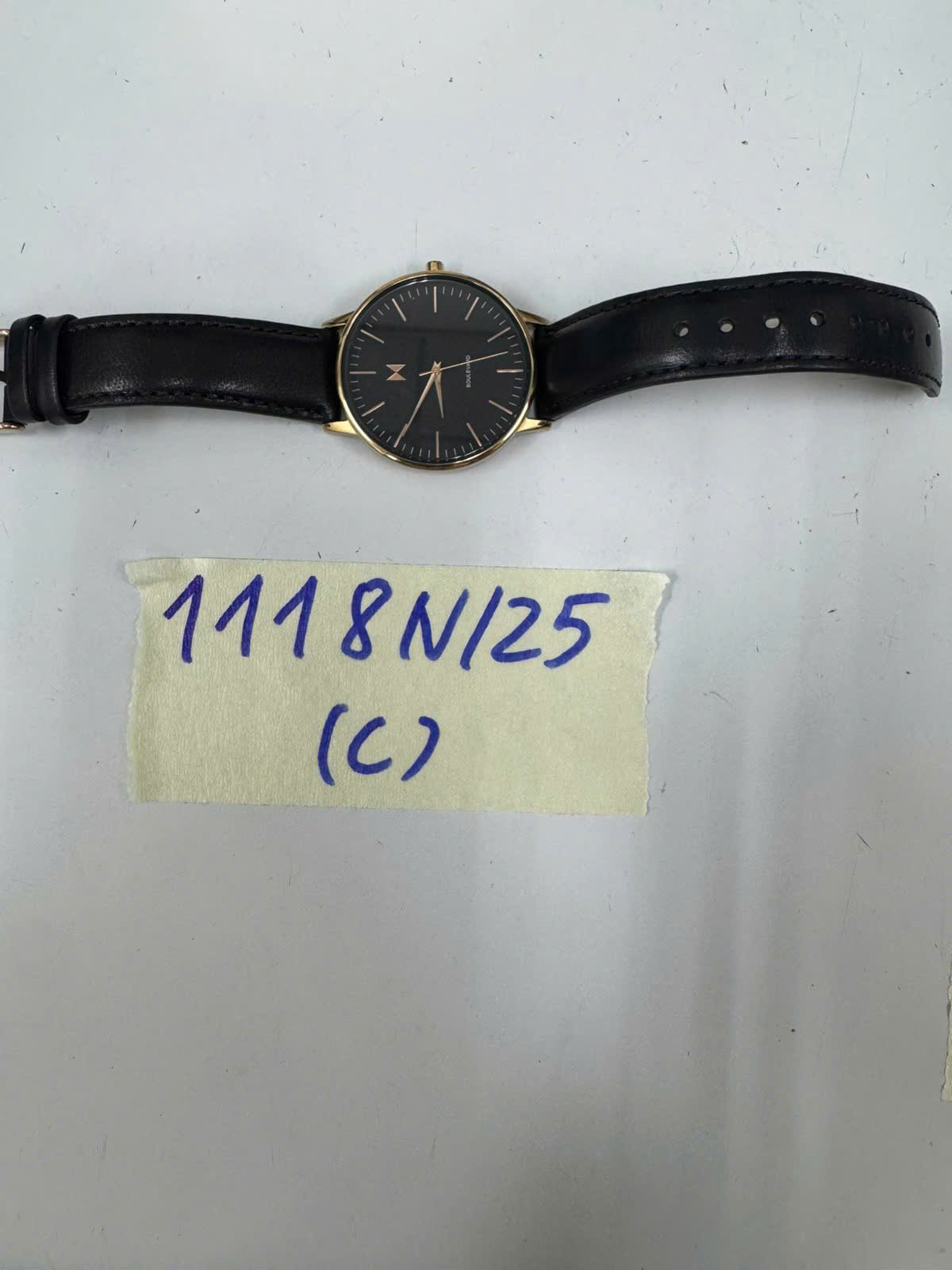 Ngày tiếp nhận: 19/6/2025 Mã hồ sơ: 1118N2025C Mô tả: 01 đồng hồ kim loại mặt màu đen viền vàng có logo chữ MVMT BOULEVARD dây có chất liệu giống da màu nâu. |