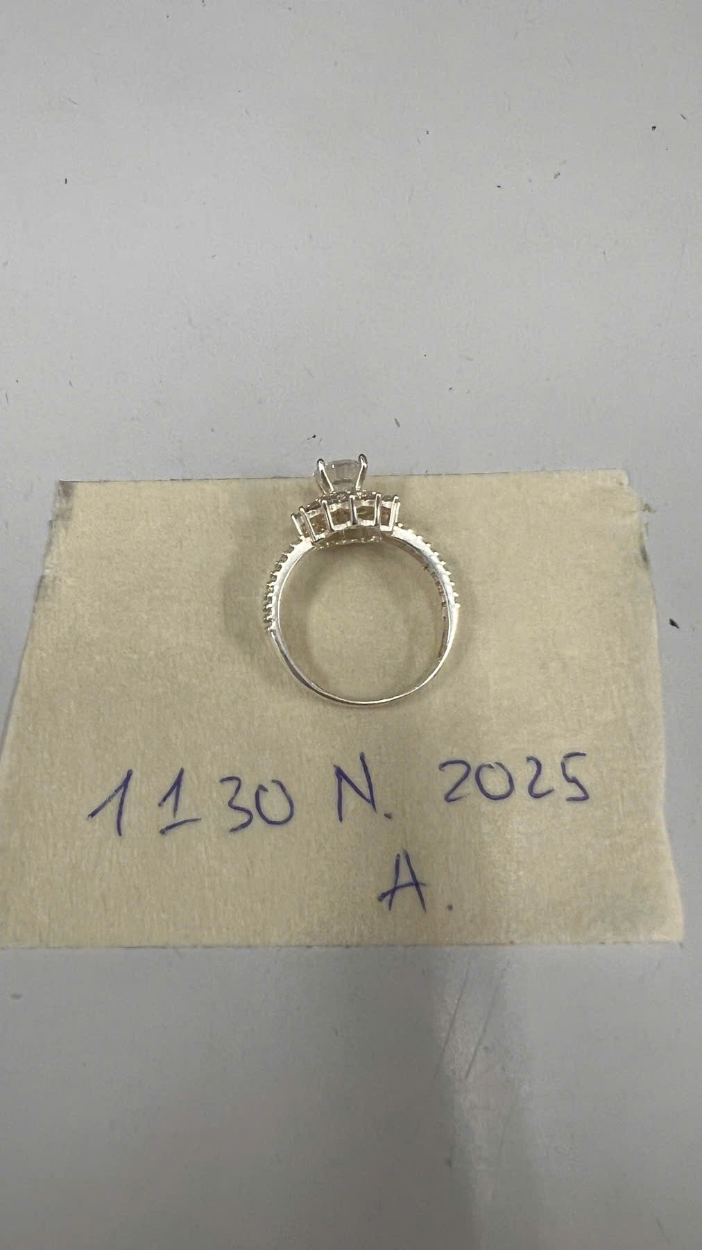 Ngày tiếp nhận: 20/6/2025 Mã hồ sơ: 1130N2025A Mô tả: 01 nhẫn kim loại màu trắng có đính đá. |