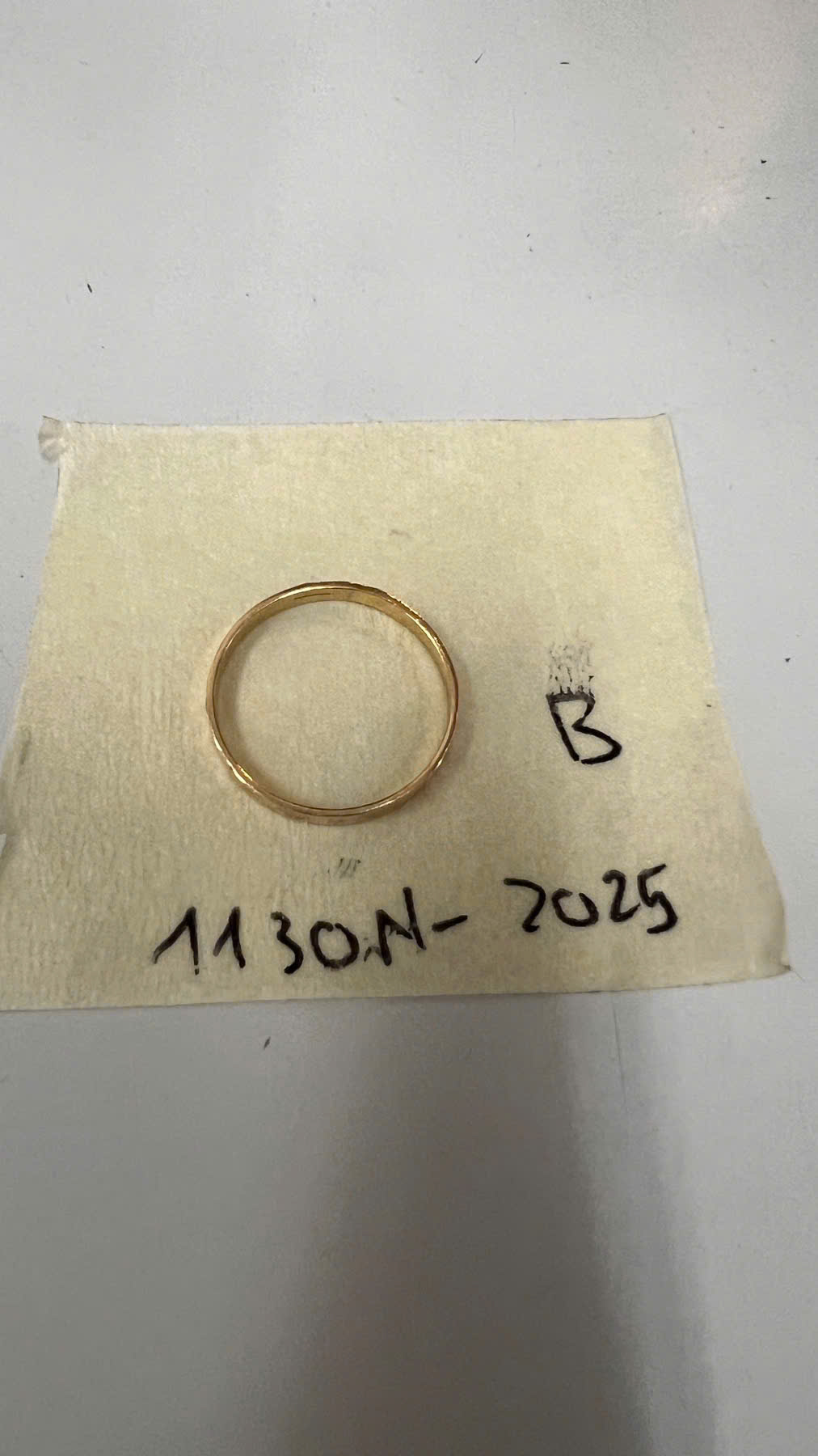 Ngày tiếp nhận: 20/6/2025 Mã hồ sơ: 1130N2025B Mô tả: 01 nhẫn kim loại màu vàng. |