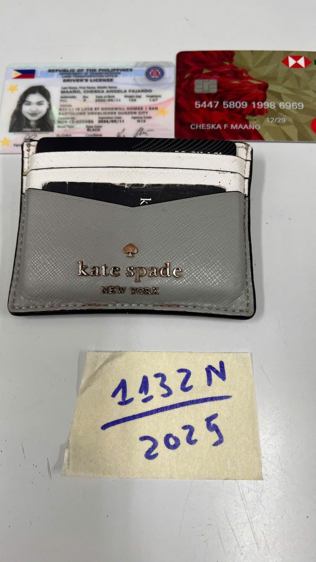 Ngày tiếp nhận: 21/6/2025 Mã hồ sơ: 1132N2025 Mô tả: 01 bóp nhỏ cầm tay bằng da màu xám có nhìu thẻ cùng tên Cheska Angela Maano. |