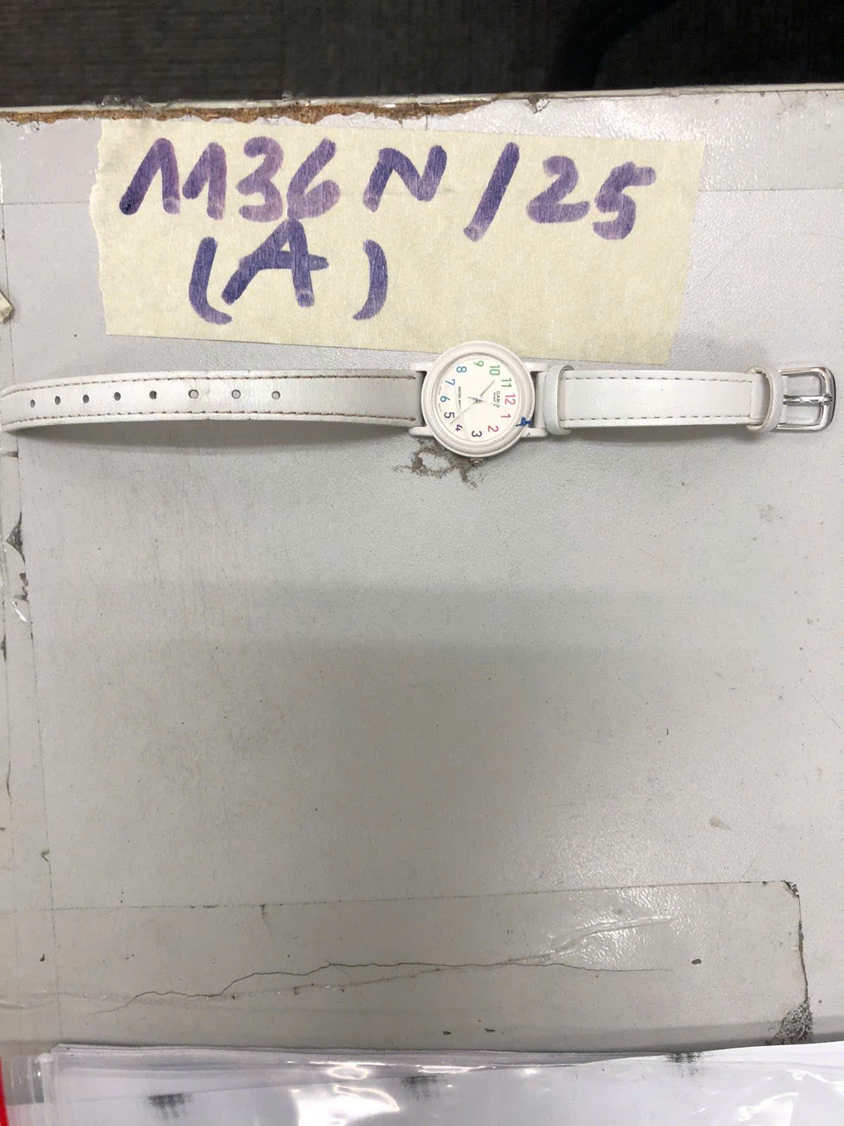 Ngày tiếp nhận: 21/6/2025 Mã hồ sơ: 1136N2025A Mô tả: 01 đồng hồ có mặt hình tròn màu trắng có chữ CASIO dây bằng da màu trắng. |