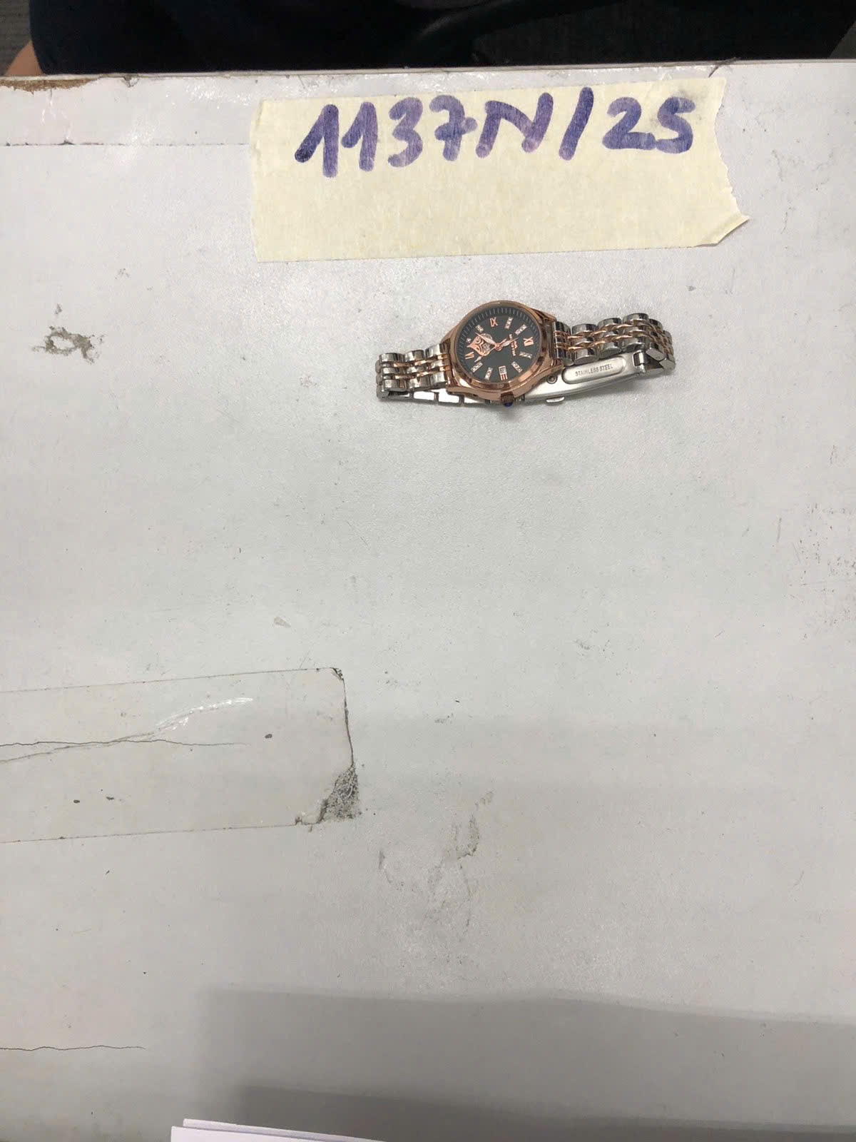 Ngày tiếp nhận: 21/6/2025 Mã hồ sơ: 1137N2025 Mô tả: 01 đồng hồ đeo tay bằng kim loại màu trắng/đồng, mặt đồng hồ hình tròn có chữ MOROTIM, dây kim loại màu trắng/đồng. |