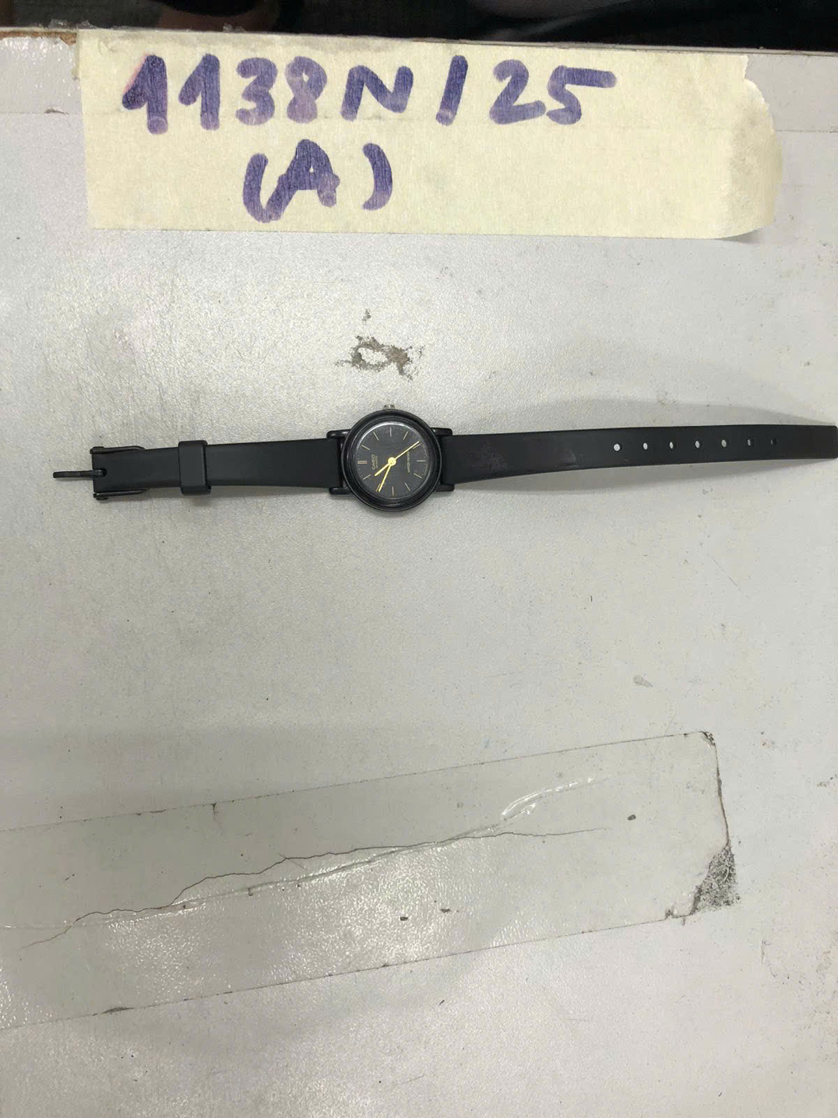 Ngày tiếp nhận: 21/6/2025 Mã hồ sơ: 1138N2025A Mô tả: 01 đồng hồ màu đen mặt tròn, dây cao su màu đen, trên mặt đồng hồ có chữ CASIO QUARTZ. |