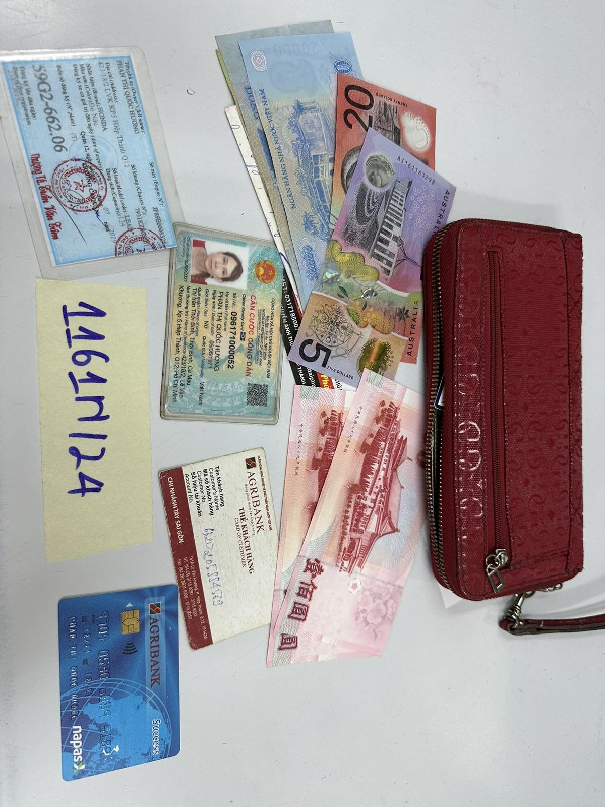 Ngày tiếp nhận: 20/7/2024 Mã hồ sơ: 1161N2024 Mô tả: 01 bóp nữ bằng vải màu đỏ có 01 CCCD Phan Thị Quốc Hương, 240.000 vnđ, 25 đô Úc, 200 tệ (Đài Loan) ngoài ra không còn gì khác. |