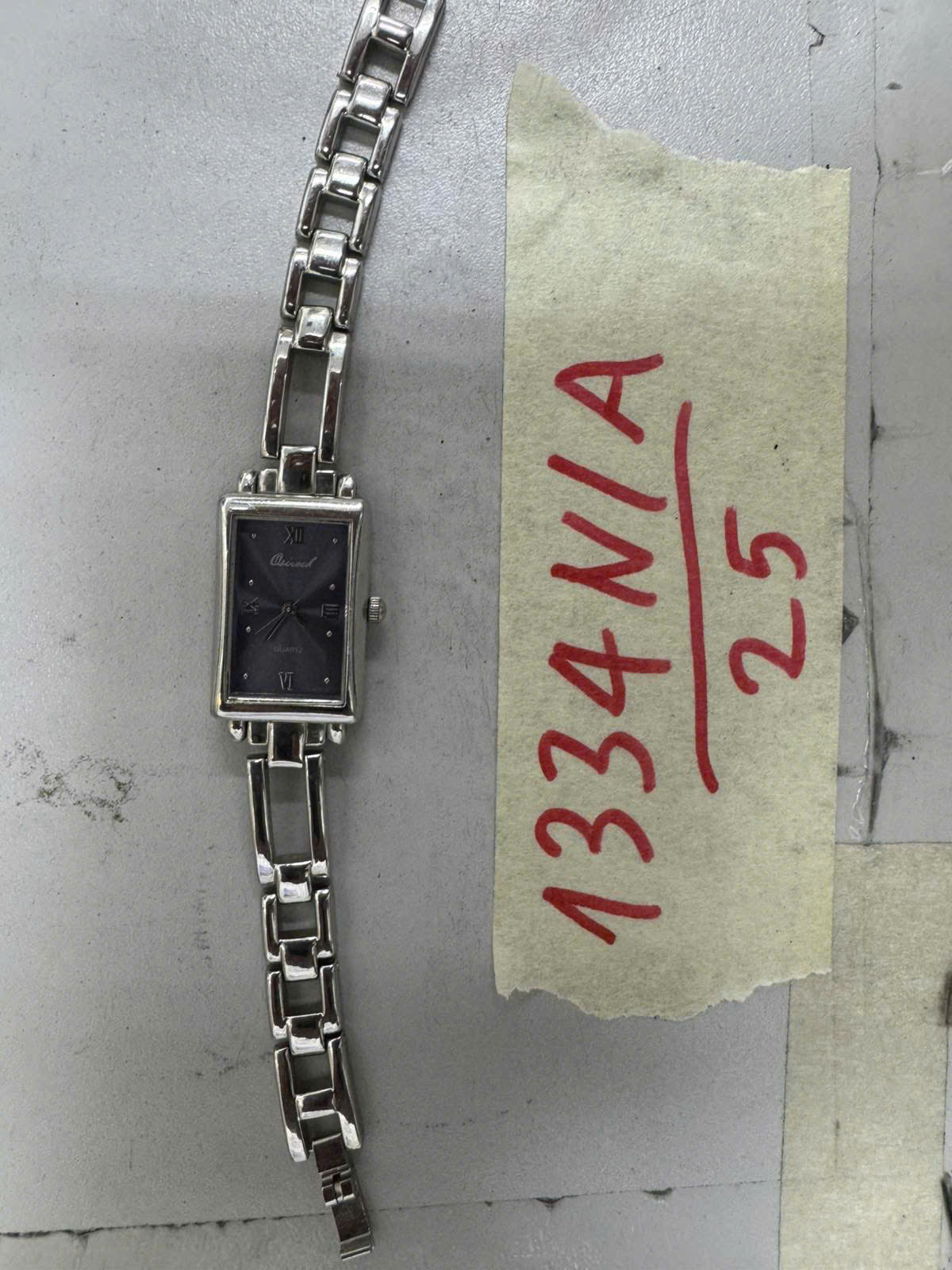 Ngày tiếp nhận: 21/7/2025 Mã hồ sơ: 1334N2025A Mô tả: 01 đồng hồ đeo tay bằng kim loại màu bạc mang nhãn hiệu OSICOCK kèm dây kim loại màu bạc.Vị trí: An ninh soi chiếu quốc tế |