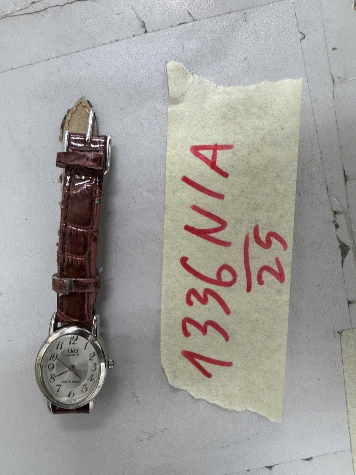 Ngày tiếp nhận: 21/7/2025 Mã hồ sơ: 1336N2025A Mô tả: 01 đồng hồ đeo tay bằng kim loại màu bạc có chữ QUARTZ kèm dây giống da màu nâu.Vị trí: An ninh soi chiếu quốc tế |