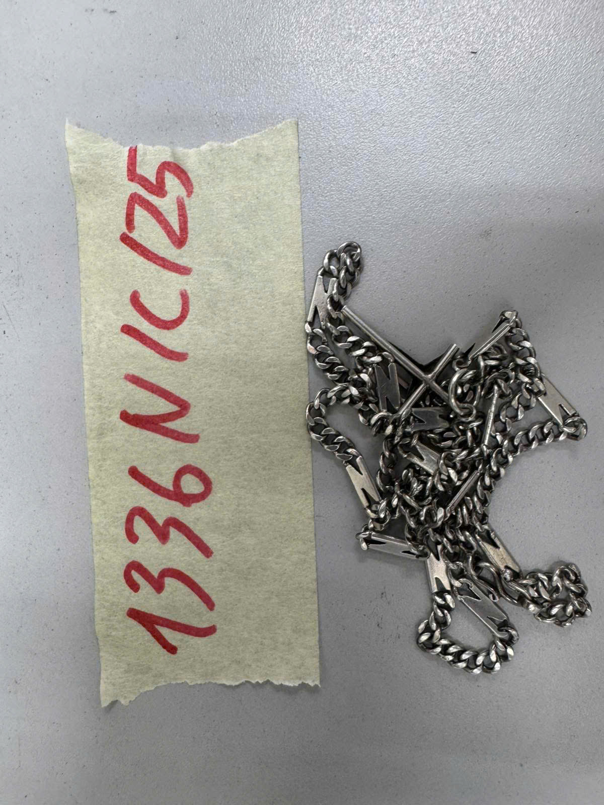 Ngày tiếp nhận: 21/7/2025 Mã hồ sơ: 1336N2025C Mô tả: 01 dây chuyền kim loại màu bạc không rõ hiệu có mặt thánh giá.Vị trí: An ninh soi chiếu quốc tế |
