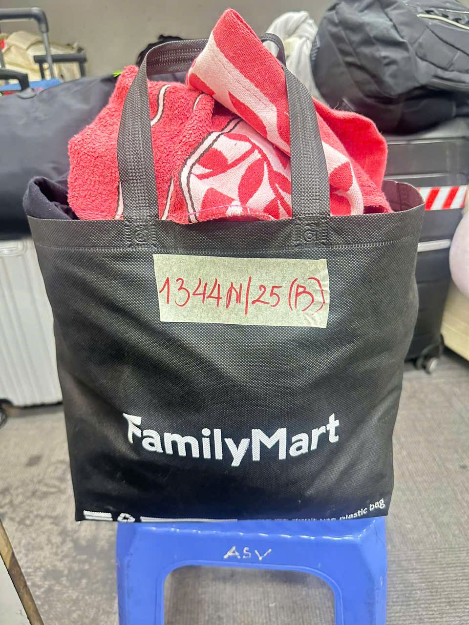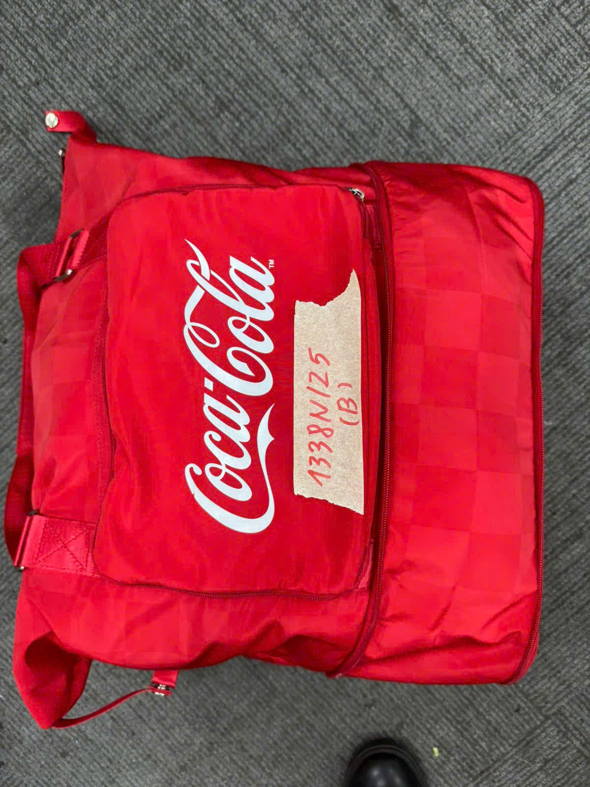 Ngày tiếp nhận: 21/7/2025 Mã hồ sơ: 1338N2025B Mô tả: 01 túi vải màu đỏ có logo chữ COCACOLA bên trong có quần áo và 04 bịch mít sấy khô. |