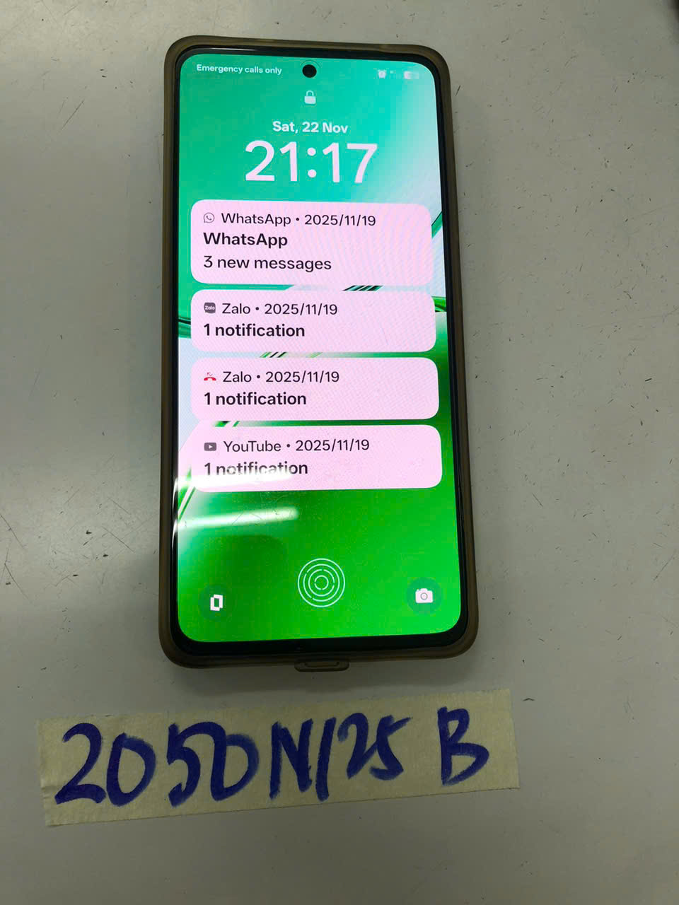 Ngày tiếp nhận: 22/11/2025 Mã hồ sơ: 2050N2025B Mô tả: 01 điện thoại OPPO màu xanh lá cây. |