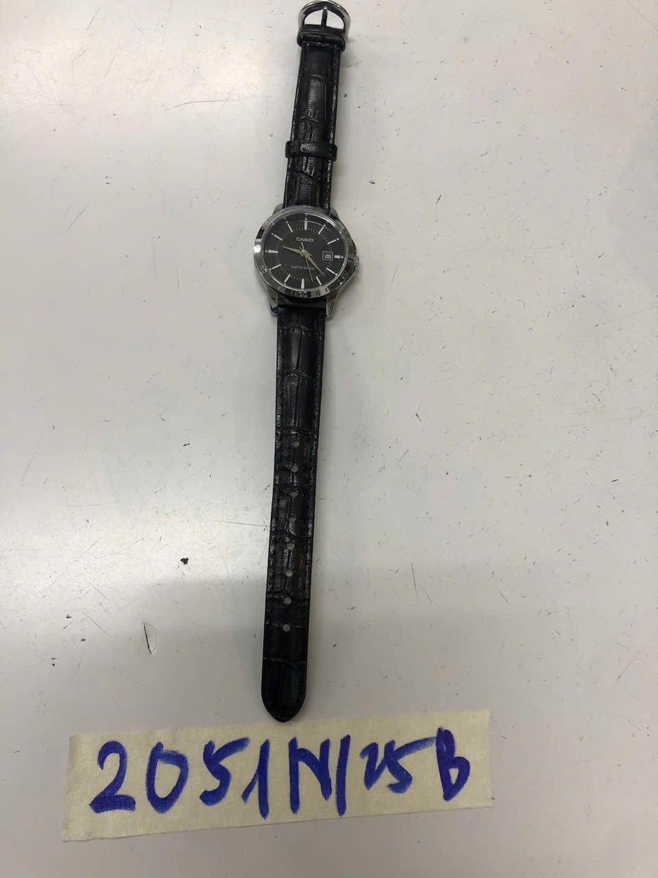 Ngày tiếp nhận: 22/11/2025 Mã hồ sơ: 2051N2025B Mô tả: 01 đồng hồ bằng kim loại mặt màu đen, viền màu trắng có chữ CASIO, dây đeo bằng da màu đen.. |