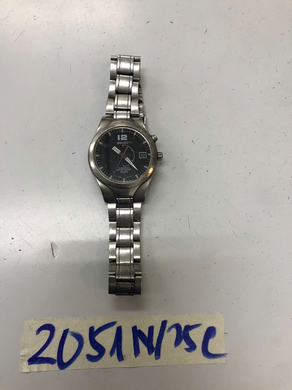 Ngày tiếp nhận: 22/11/2025 Mã hồ sơ: 2051N2025C Mô tả: 01 đồng hồ bằng kim loại mặt màu đen, viền màu trắng có chữ SEIKO KINETIC WATER RESIST 100M, dây đeo bằng kim loại màu bạc. |