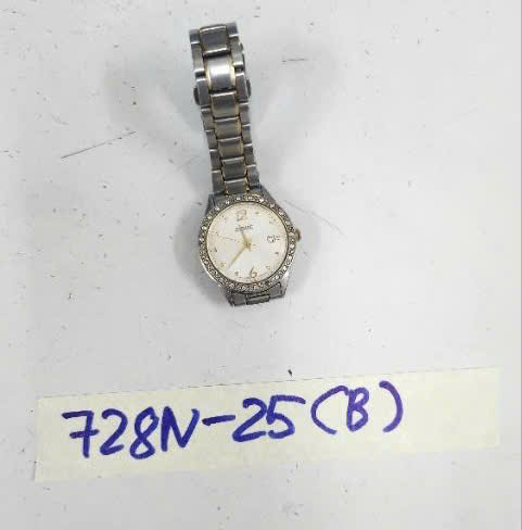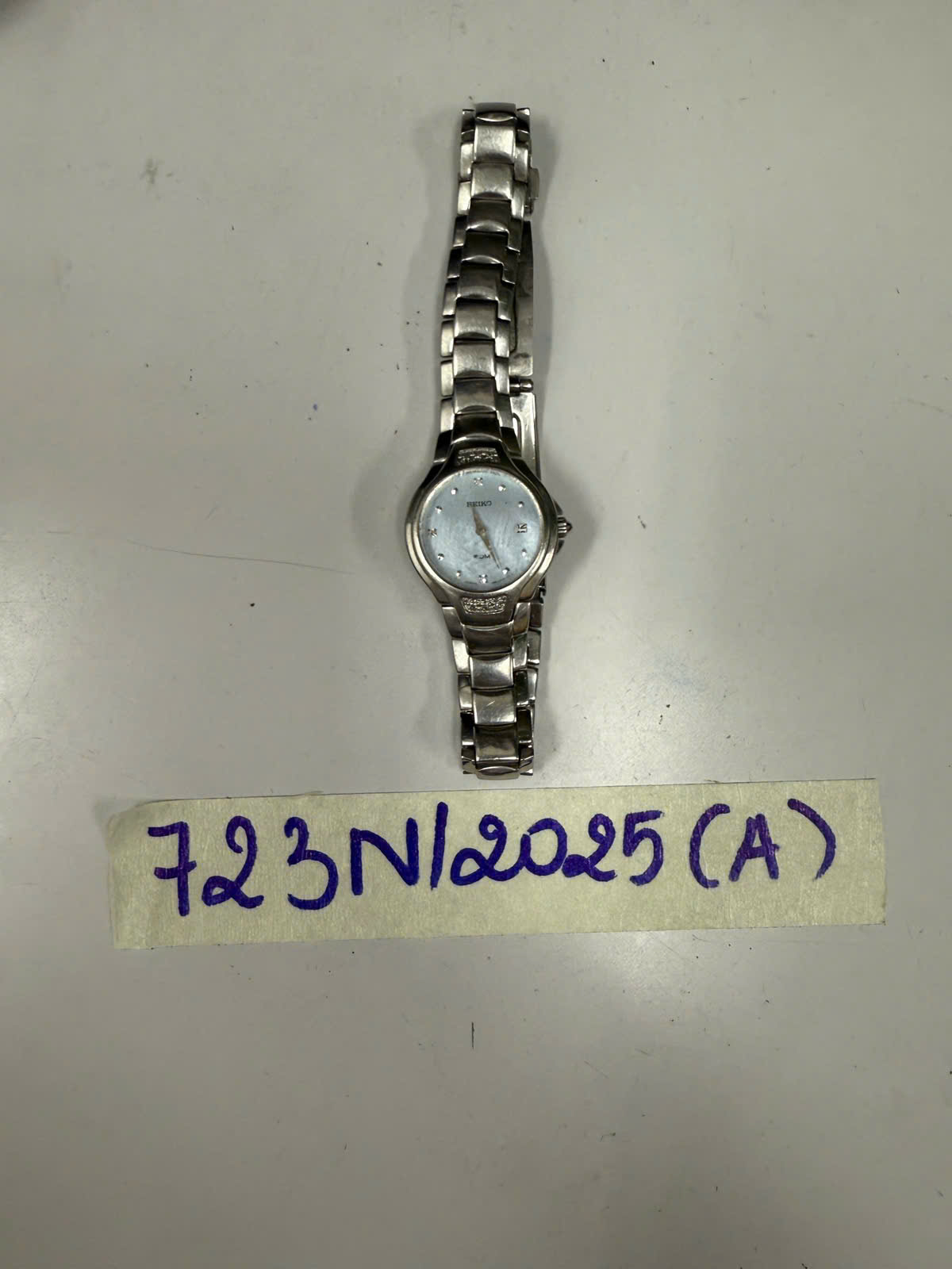 Ngày tiếp nhận: 21/4/2025 Mã hồ sơ: 728N2025B Mô tả: 01 đồng hồ kim loaại màu bạc SEIKO có đính đá. |