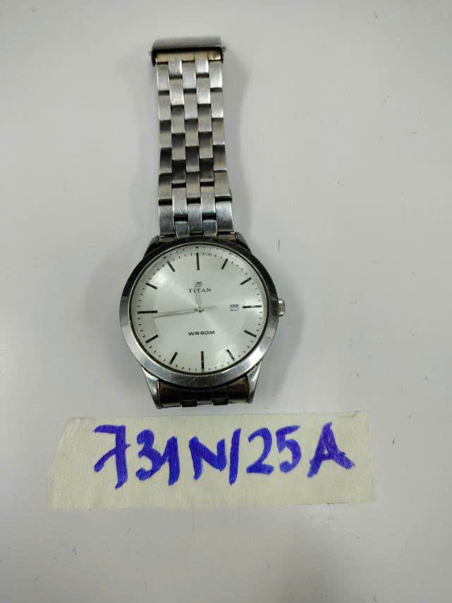 Ngày tiếp nhận: 22/4/2025 Mã hồ sơ: 731N2025A Mô tả: 01 Đồng hồ màu bạc bằng kim loại mặt đồng hổ có chữ Titan. |