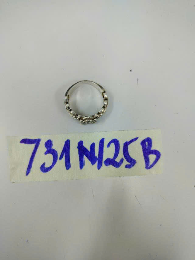 Ngày tiếp nhận: 22/4/2025 Mã hồ sơ: 731N2025B Mô tả: 01 Nhẫn kim loại màu bạc có hình rồng 2 bên chữ ở giữa. |