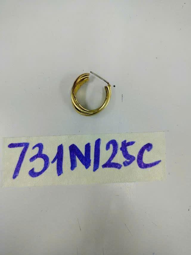 Ngày tiếp nhận: 22/4/2025 Mã hồ sơ: 731N2025C Mô tả: 01 Hoa tai kim loại màu vàng 3 thanh đan nhau. |