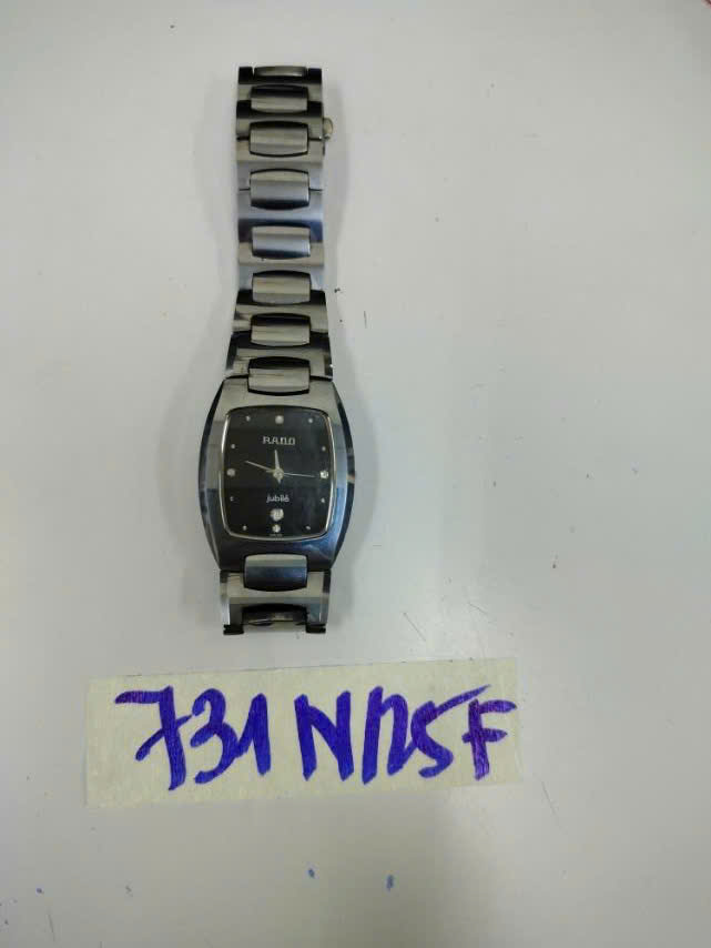 Ngày tiếp nhận: 22/4/2025 Mã hồ sơ: 731N2025F Mô tả: 01 Đồng hồ chữ "Rado" màu ánh xanh dây kim loại. |