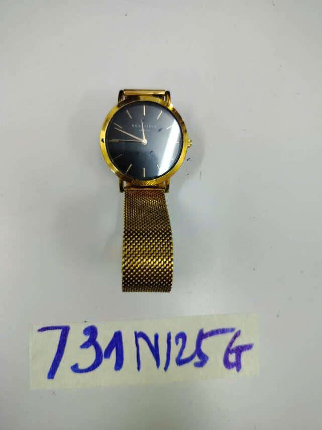 Ngày tiếp nhận: 22/4/2025 Mã hồ sơ: 731N2025G Mô tả: 01 Đồng hồ kim loại màu vàng có chữ "Rose field". |