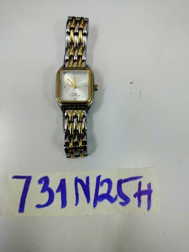 Ngày tiếp nhận: 22/4/2025 Mã hồ sơ: 731N2025H Mô tả: 01 Đồng hồ kim loại mặt vuông dây trắng vàng. |
