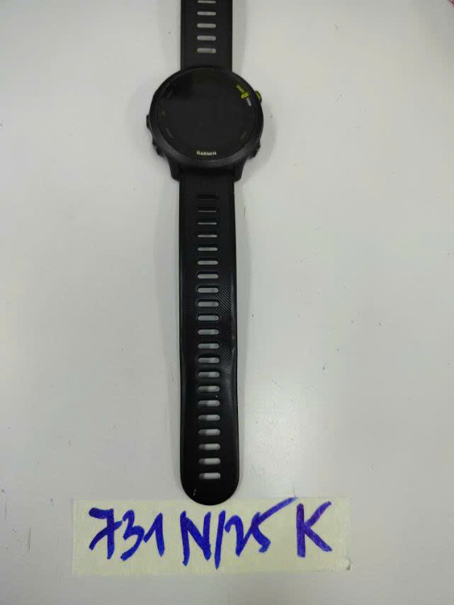 Ngày tiếp nhận: 22/4/2025 Mã hồ sơ: 731N2025K Mô tả: 01 Đồng hồ màu đen dây nhựa đen trên mặt đồng hồ có chữ "Garmin". |