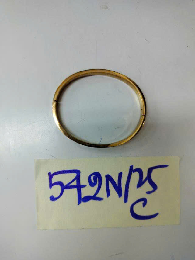 Ngày tiếp nhận: 24/03/2025 Mã hồ sơ: 542N2025C Mô tả: 01 vòng tay kim loại, mặt trong vòng tay có chữ "CARTIER". |