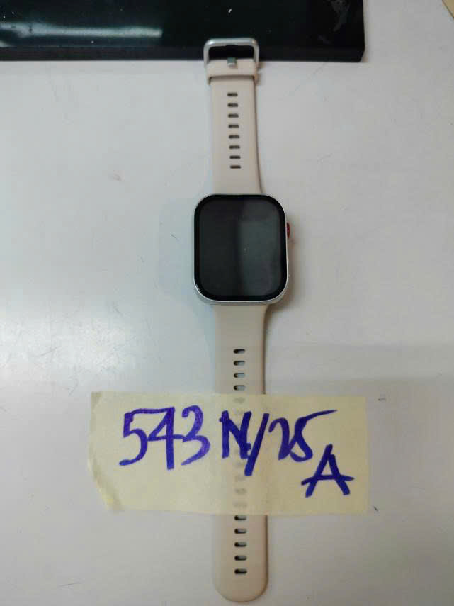 Ngày tiếp nhận: 24/03/2025 Mã hồ sơ: 543N2025A Mô tả: 01 đồng hồ thông minh đây cao su màu hồng, mặt đồng hồ vuông màu đen viên bạc, trên tút vận (màu đó) có chữ "HUA WEI WATCH PIT". |