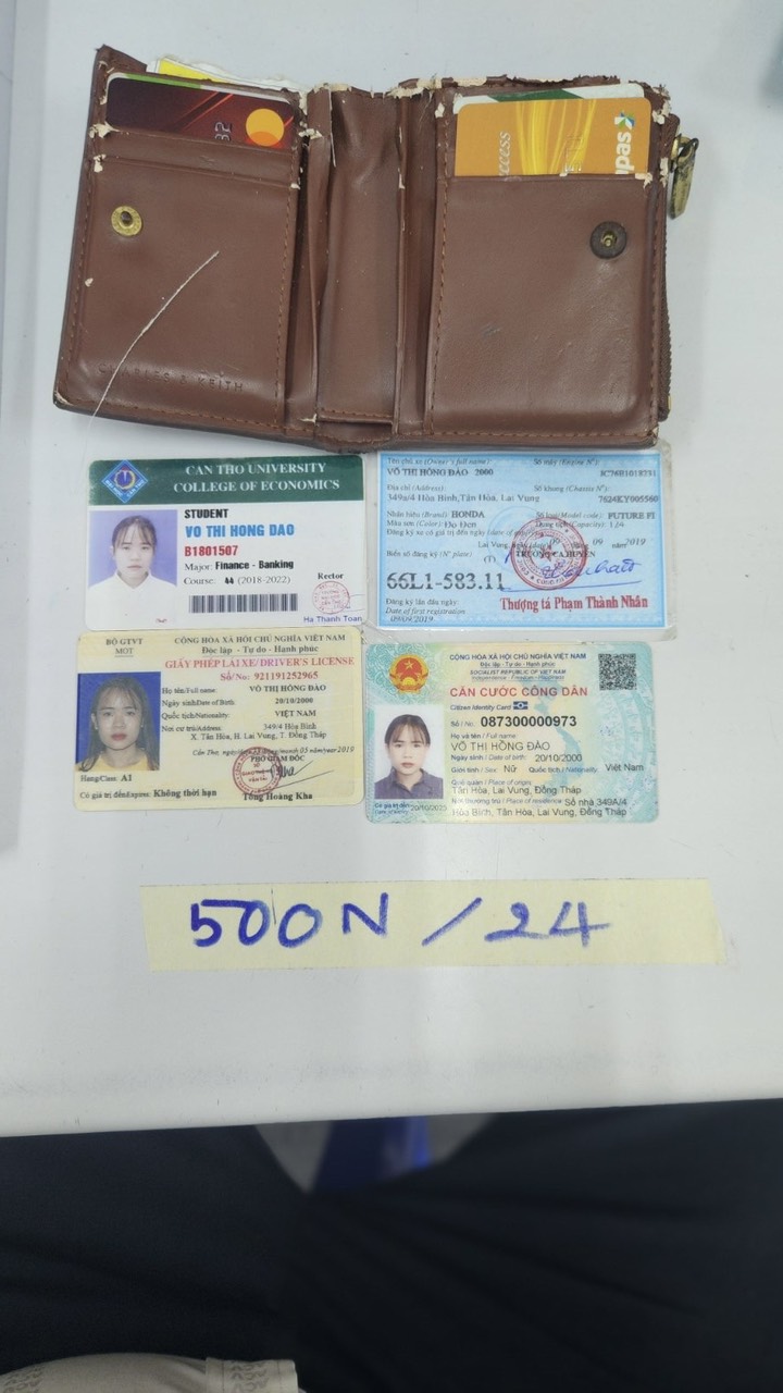 Ngày tiếp nhận: 25/03/2024 trong có có 01 thẻ visa JoYoung Chan, 01 bằng lái xe tiếng Hàn Quốc, 204.000won, 1.480.000đ. |