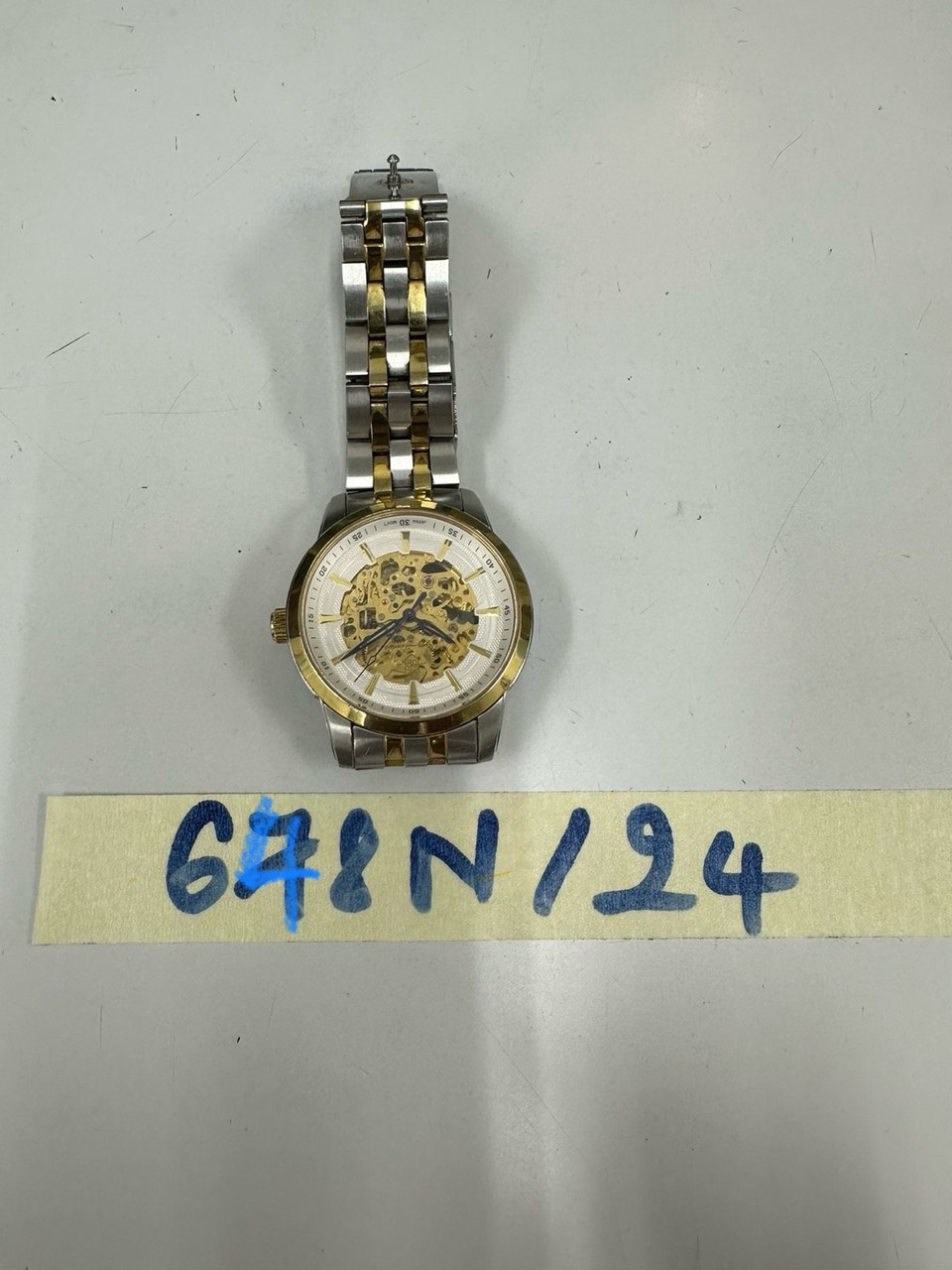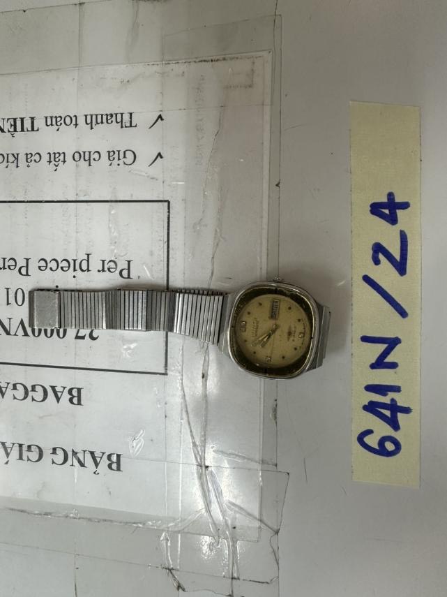 Ngày tiếp nhận: 23/4/2024 kim loại màu bạc, mặt đồng hồ nhiều vết xước. |