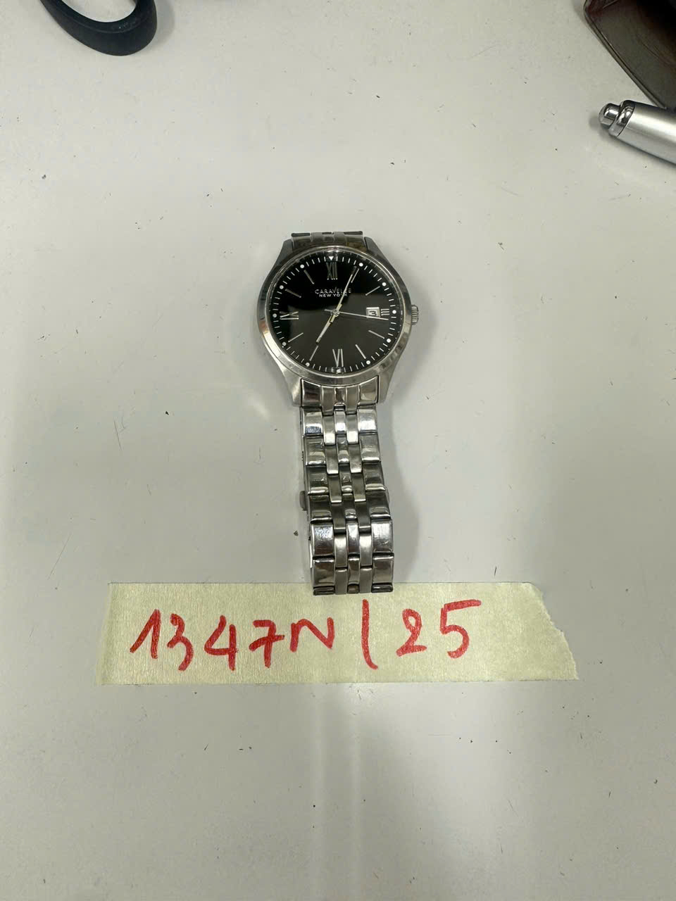 Ngày tiếp nhận: 23/7/2025 Mã hồ sơ: 1347N2025 Mô tả: 01 Đồng hồ đeo tay, vỏ và dây kim loại màu tràng, mặt đồng hồ màu đen có ghi chữ Caravelle new york đã qua sử dụng. |