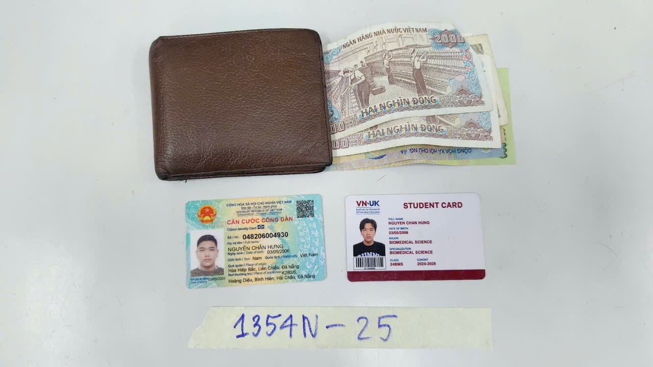 Ngày tiếp nhận: 24/7/2025 Mã hồ sơ: 1354N2025 Mô tả: 01 ví nam màu nâu có: 01 CCCD và 01 thẻ sinh viên cùng tên Nguyễn Chấn Hưng, 140.000VNĐ. |