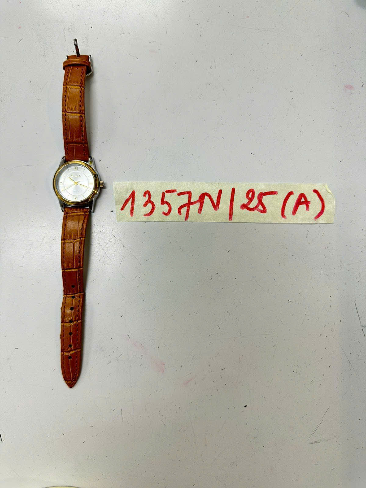 Ngày tiếp nhận: 25/7/2025 Mã hồ sơ: 1357N2025A Mô tả: 01 đồng hồ kim có chữ Baosida, dây đeo màu nâu. |