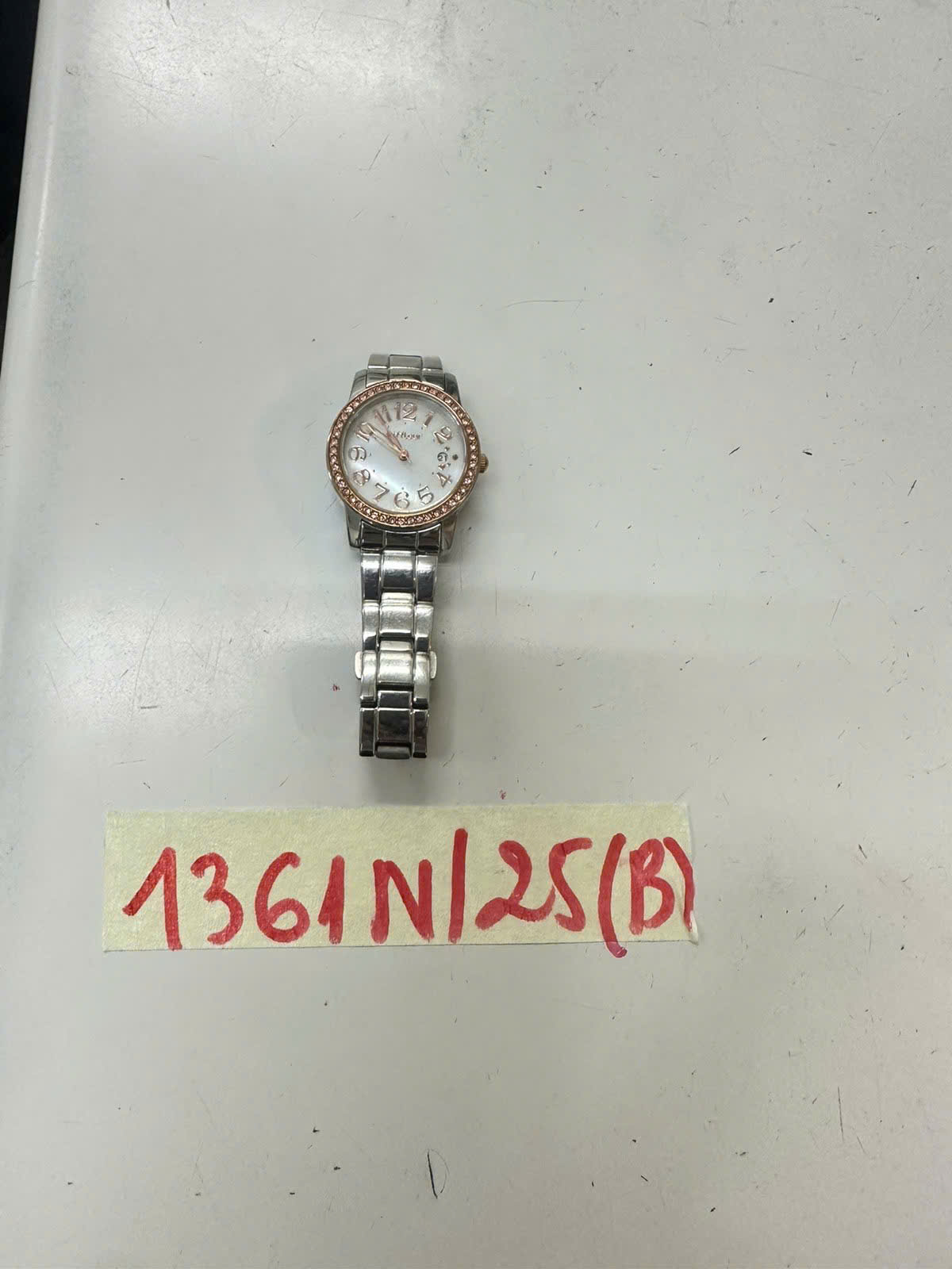 Ngày tiếp nhận: 25/7/2025 Mã hồ sơ: 1361N2025B Mô tả: 01 đồng hồ kim loại hình tròn màu bạc mang nhãn hiệu VIFFLEUR PARIS. |