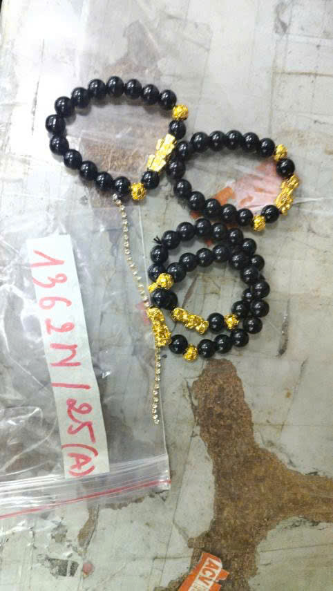 Ngày tiếp nhận: 25/7/2025 Mã hồ sơ: 1362N2025A Mô tả: 04 vòng đeo tay chuỗi hạt màu đen có họa tiết tì hưu màu vàng, 01 vòng tay màu vàng. |