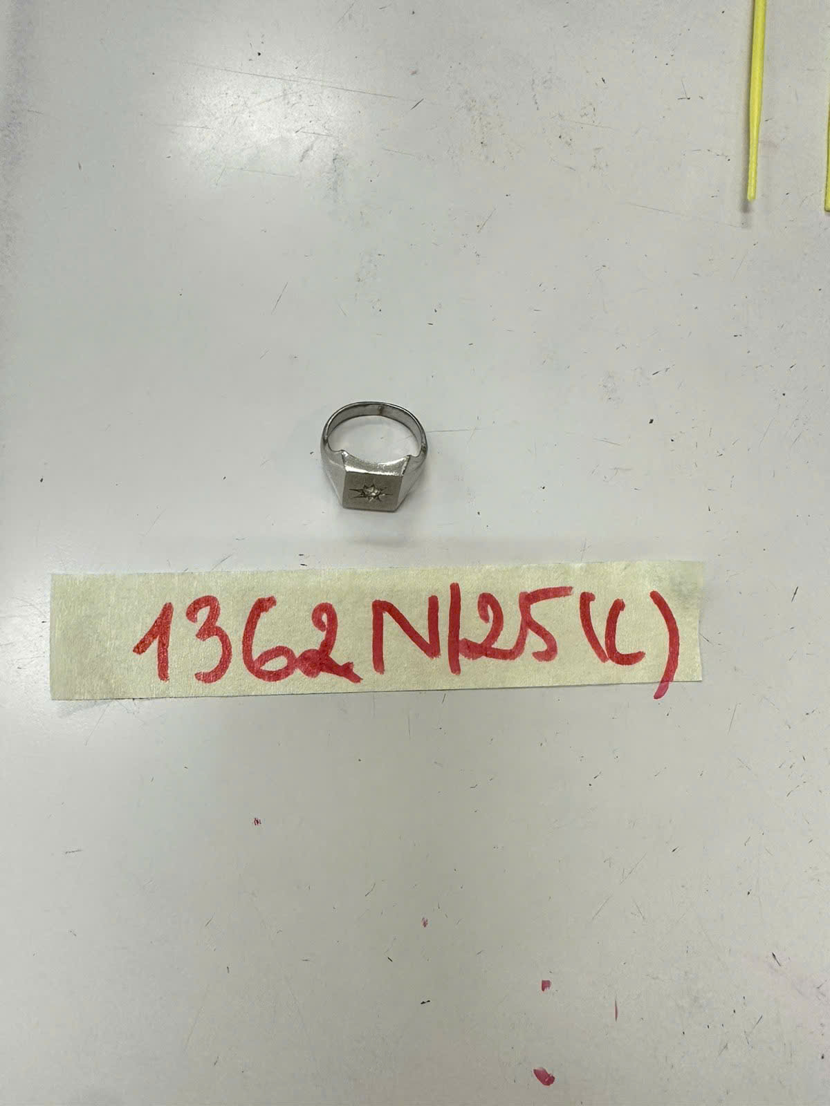 Ngày tiếp nhận: 25/7/2025 Mã hồ sơ: 1362N2025C Mô tả: 01 nhẫn màu bạc có mặt hình vuông và họa tiết hình ngôi sao. |