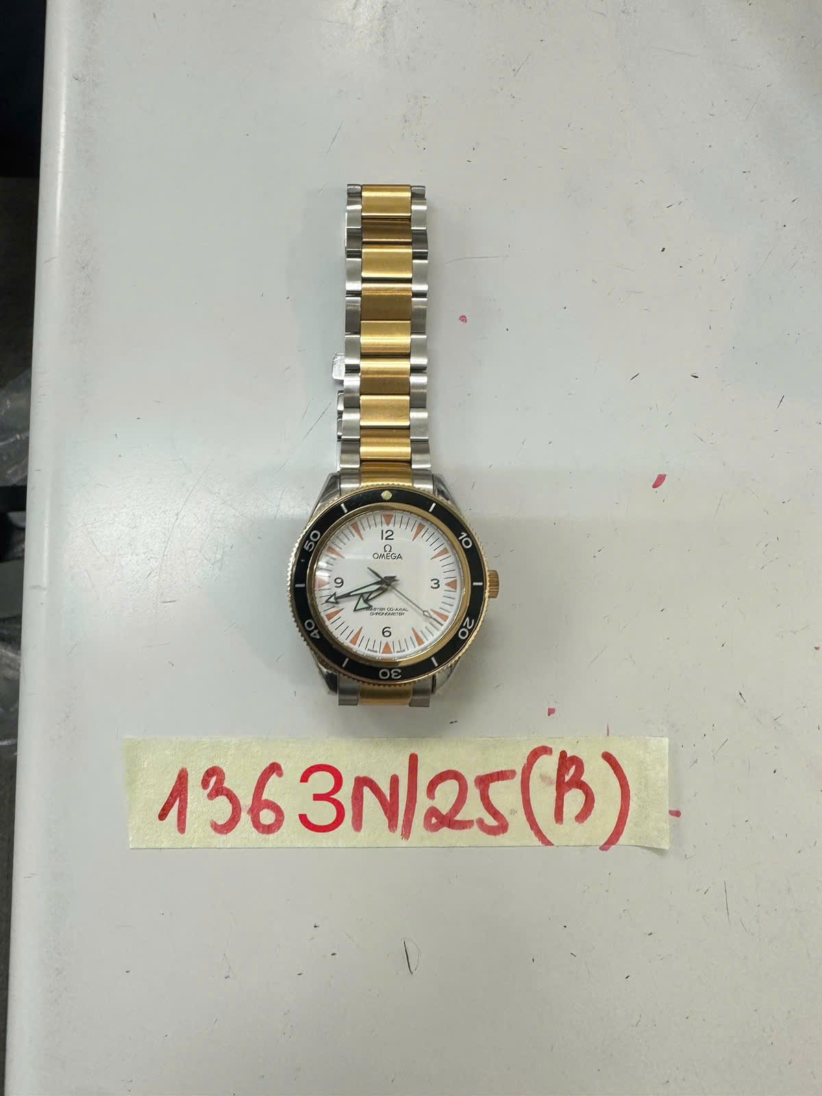 Ngày tiếp nhận: 25/7/2025 Mã hồ sơ: 1363N2025B Mô tả: 01 đồng hồ bằng kim loại màu đen viềng vàng có chữ OMEGA dây đeo kim loại màu vàng viềng bạc. |
