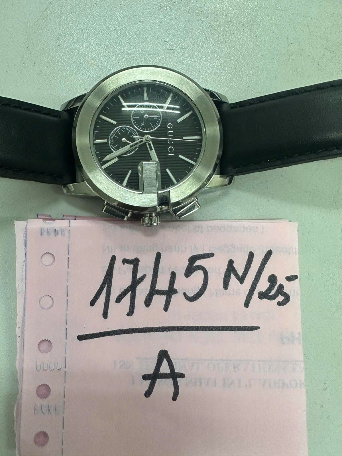 Ngày tiếp nhận: 24/9/2025 Mã hồ sơ: 1745N2025A Mô tả: 01 đồng hồ thông minh bằng kim loại mặt tròn màu bạc, có chữ "GUCCI", dây giống da màu đen. |