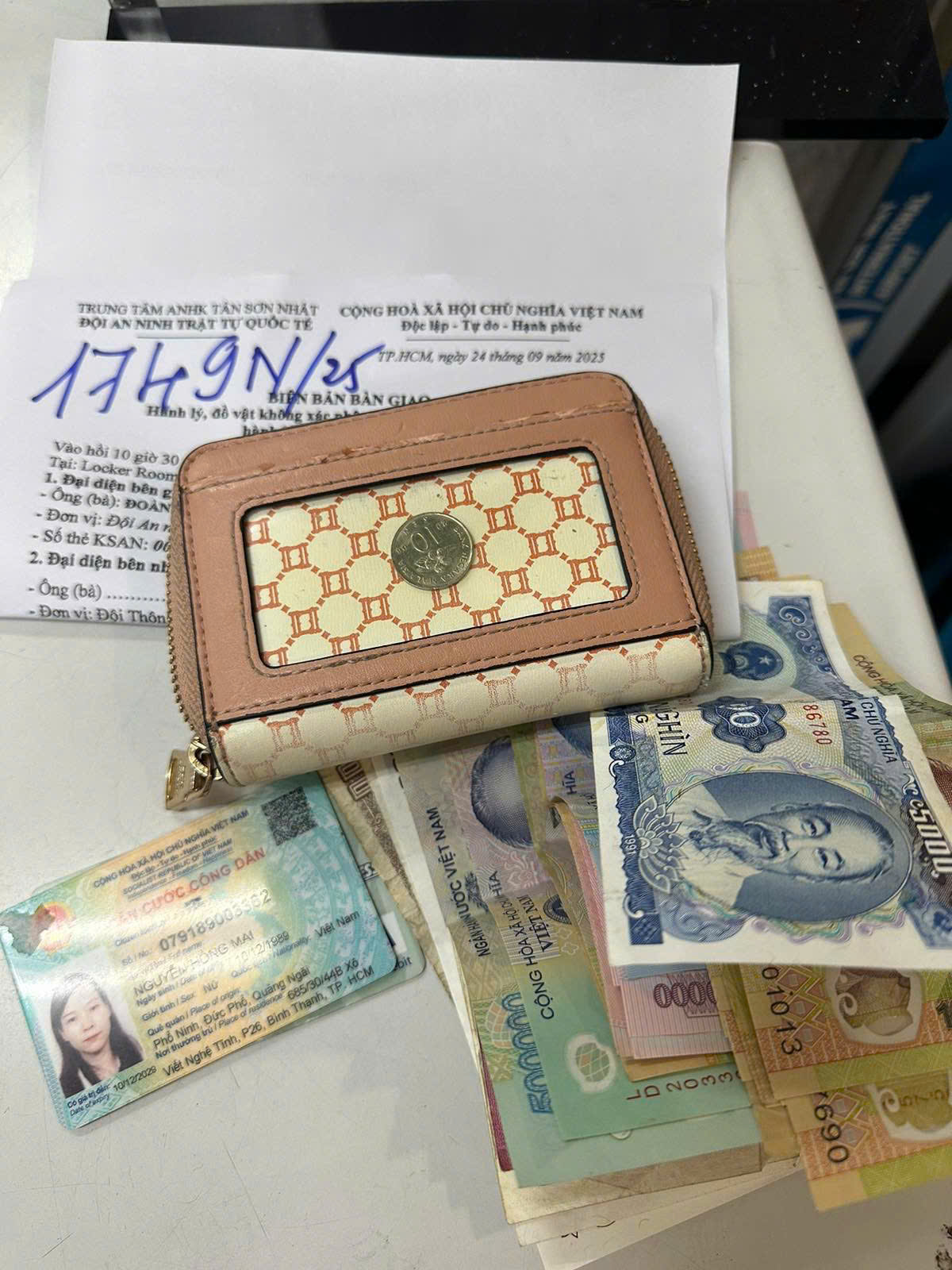 Ngày tiếp nhận: 24/9/2025 Mã hồ sơ: 1749N2025 Mô tả: 01 ví da màu be , bên trong có thẻ ngân hàng, giấy tờ tùy thân tên NGUYEN HONG MAI và 1.715.000vnd. |