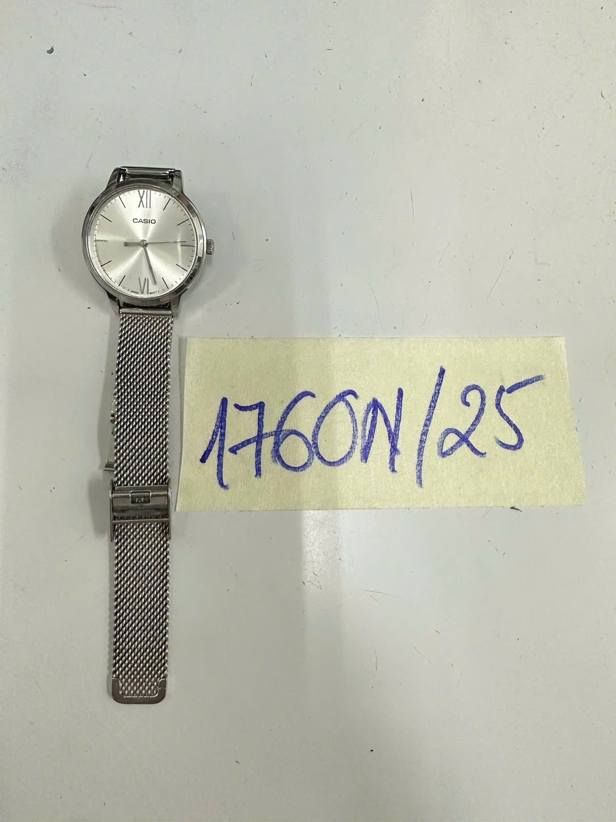 Ngày tiếp nhận: 26/9/2025 Mã hồ sơ: 1760N2025 Mô tả: 01 đồng hồ mặt tròn bằng kim loại màu bạc có chữ "CASIO", dây kim loại màu bạc. |