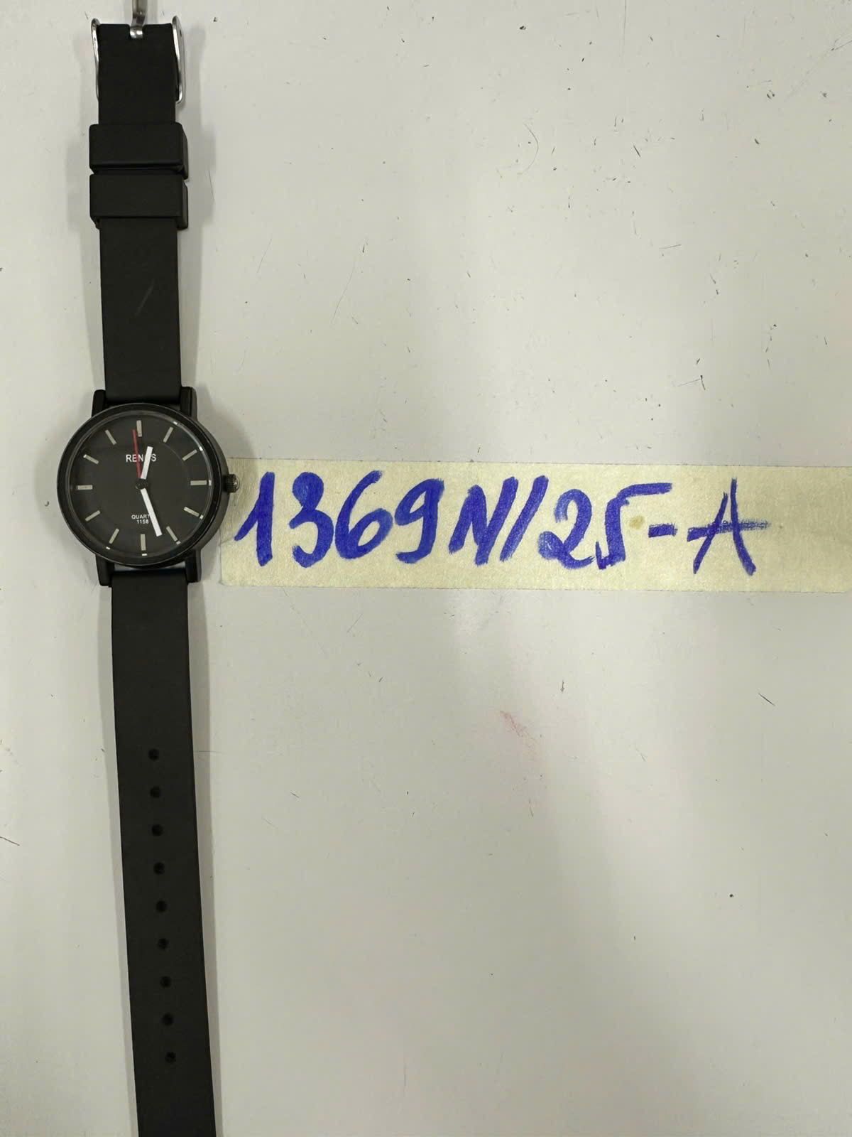 Ngày tiếp nhận: 26/7/2025 Mã hồ sơ: 1369N2025A Mô tả: 01 đồng hồ đeo tay bằng nhựa màu đen, mặt đh hình tròn có chữ RENOS. |