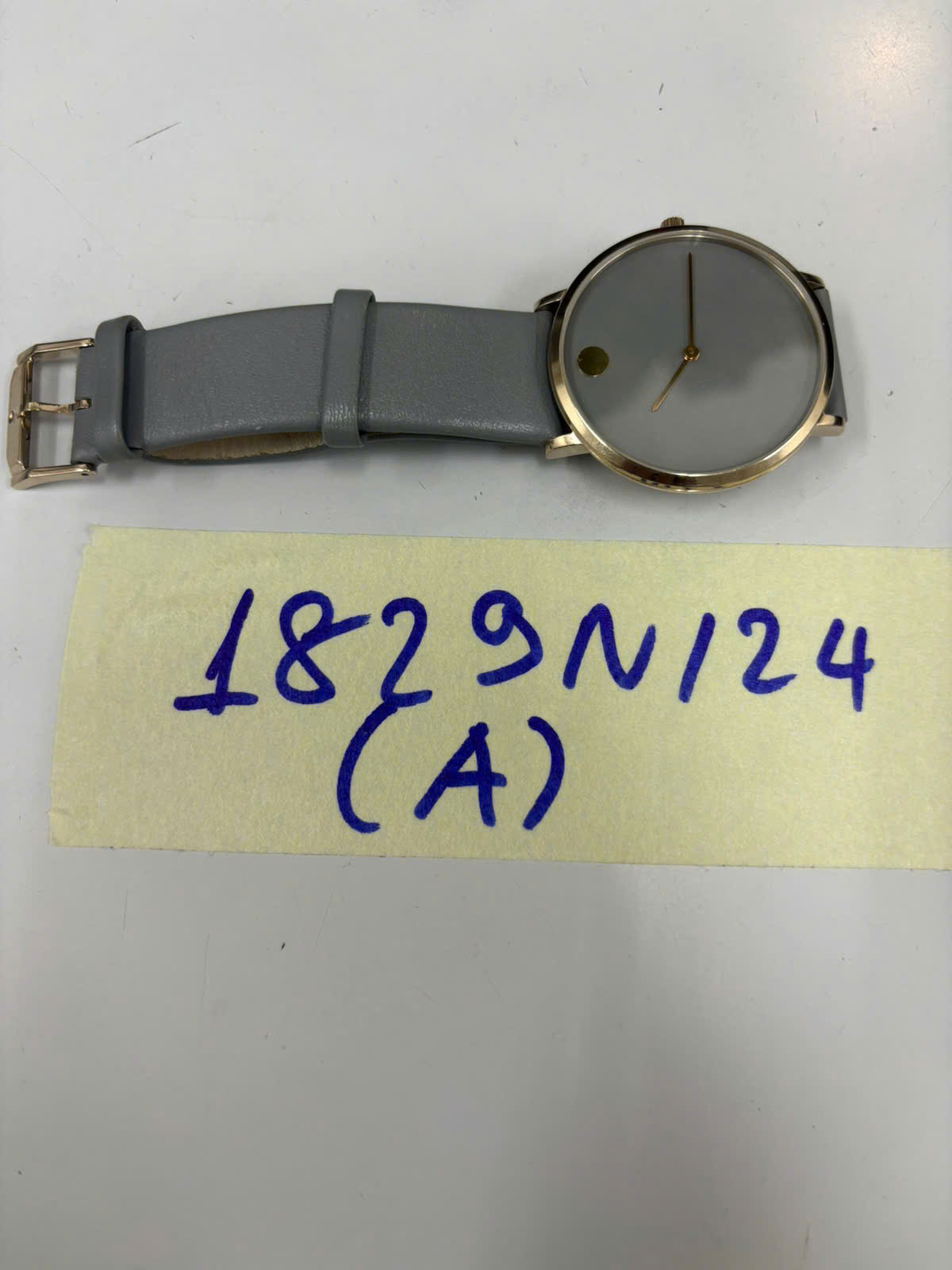 Ngày tiếp nhận: 26/10/2024 Mã hồ sơ: 1829N2024A Mô tả: 01 đồng hồ dây da màu xám mặt tròn có chữ MOVADO. |